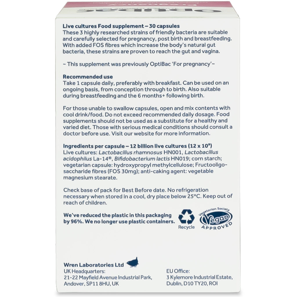 "OptiBac Probiotics 'For pregnancy' has been created especially for pregnant women, designed for use pre-and post-partum (from conception through to birth and early motherhood). It contains three strains, Lactobacillus rhamnosusHN001,BifidobacteriumlactisHN019, and Lactobacillus acidophilusLa-14®, which have been scientifically researched in hundreds of pregnant and breastfeeding women and are proven to reach the gut and vagina alive. Suggested for daily use from conception onwards, each easy-to-swallow capsule provides 30mg of natural FOS(Fructooligosaccharides) fibres and 12 billion live microorganisms, guaranteed until the date of expiry. Capsules can be opened, and contents added to cool, non-acidic foods or drinks. Each pack contains a 30-day supply."
