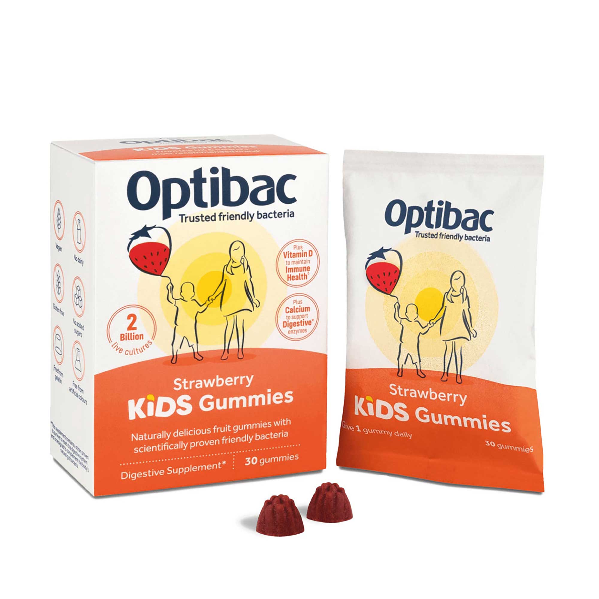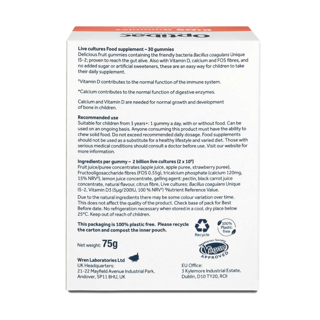 "Optibac Kids Gummies is a naturally delicious, vegan friendly bacteria gummy supplement. Developed for children from 3 years onwards, each gummy contains 2 billion live cultures of Bacillus coagulans Unique IS-2, which has been scientifically researched in children, as well as calcium and vitamin D3. Made with real fruit concentrates for a more natural option, with no artificial sweeteners, colours or flavours and no added sugars. Each gummy contains 2 billion of good bacteria"