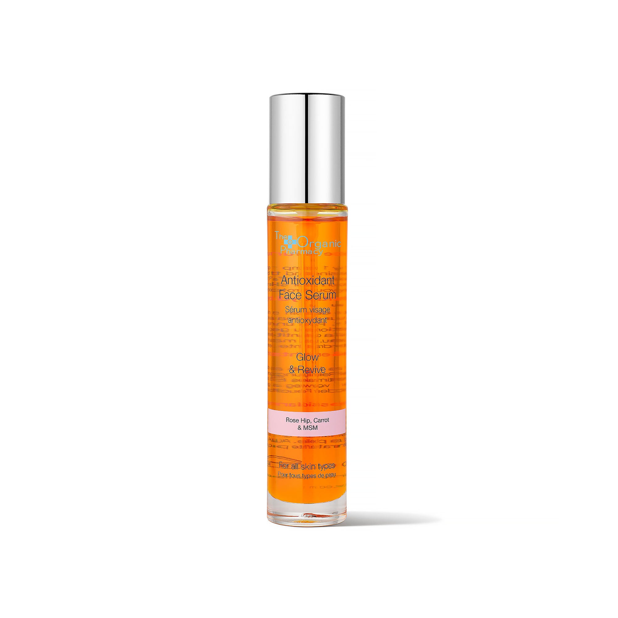 "This glow-inducing Antioxidant Face Serum is infused with powerful vitamin-rich oils to revive skin. A silky blend of vitamin-rich oils, including RoseHip, Carrot and Grapefruit. This intense yet light oil with clinically proven antioxidant activity prevents free radical damage and supercharges skin with synergistic action of Alpha Lipoic Acid, DMAE and MSM. Used alone it plumps skin and adds luminosity. Combined with any other serum, its lipid-rich formula benefits all skin types, helping seal all activies to intensify the results. Suitable for Vegans. 98.7% Organic"