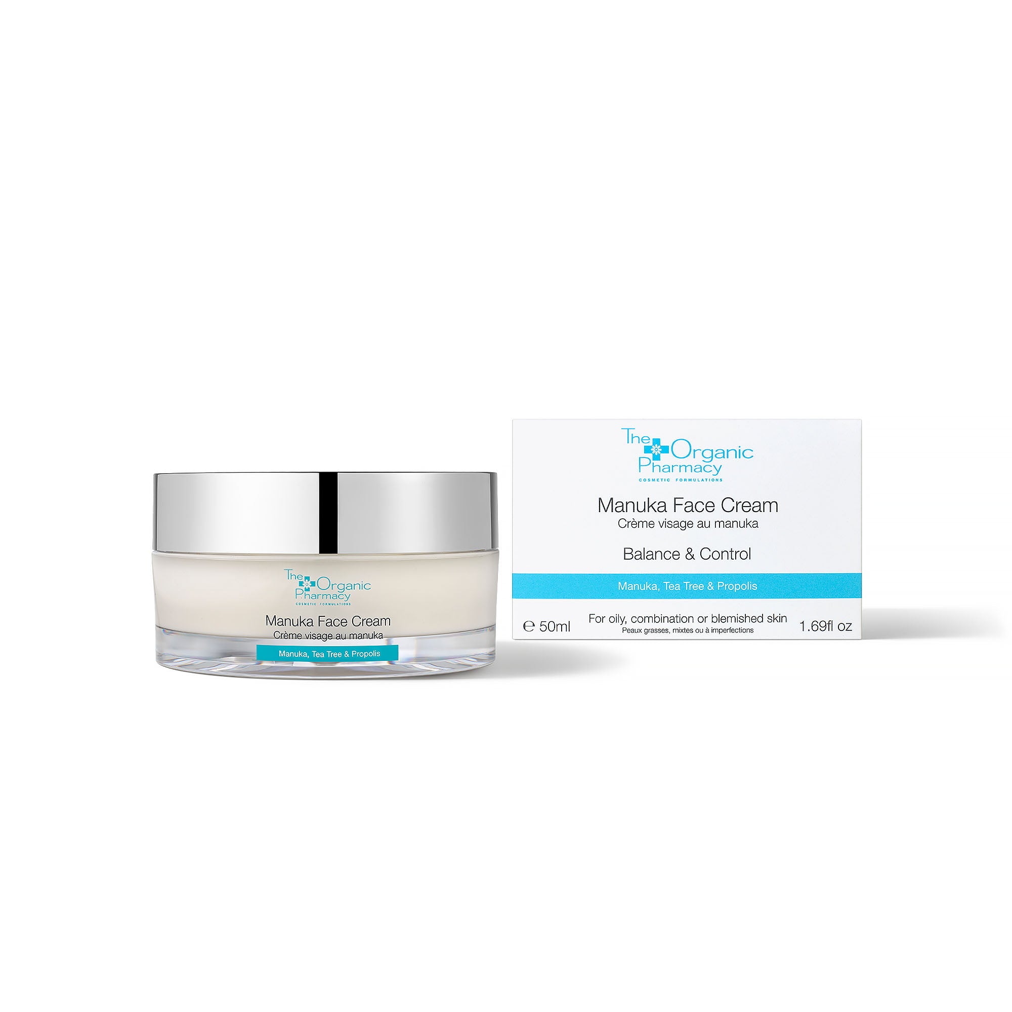 "Soothing and antibacterial Manuka, Tea Tree and Propolis provide skin balance and control in this light, non-greasy cream. Extracts of Lavander and Tea Tree clear and calm irritation, making it a brilliant decongestant for oily and acne prone skin. 85.5% organic"