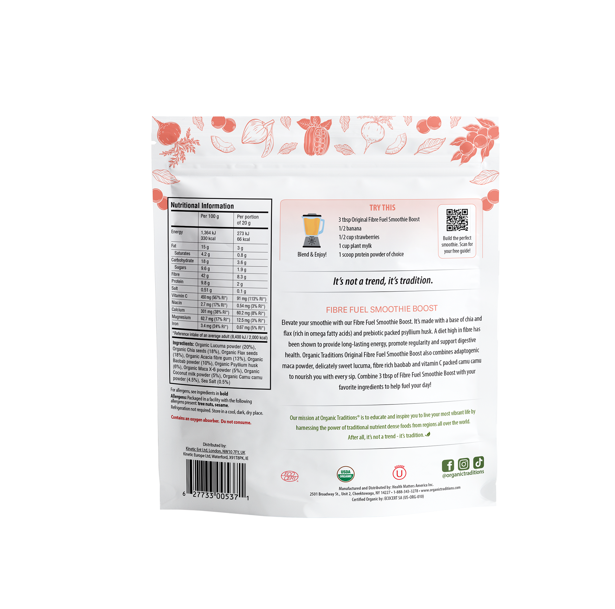 "Elevate your smoothie with our Fibre Fuel Smoothie Boost. It’s made with a base of chia and flax (rich in omega fatty acids) and prebiotic packed psyllium husk. A diet high in fibre has been shown to provide long-lasting energy, promote regularity and support digestive health. Organic Traditions Original Fibre Fuel Smoothie Boost also combines adaptogenic maca powder, delicately sweet lucuma, bre rich baobab and vitamin C packed camu camu to nourish you with every sip. Combine 3 tbsp of Fibre Fuel Smoothie Boost with your favorite ingredients to help fuel your day!"