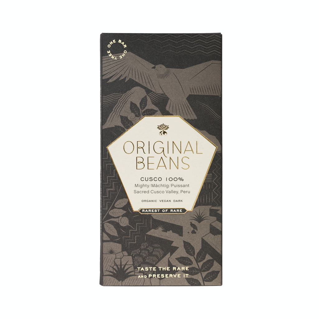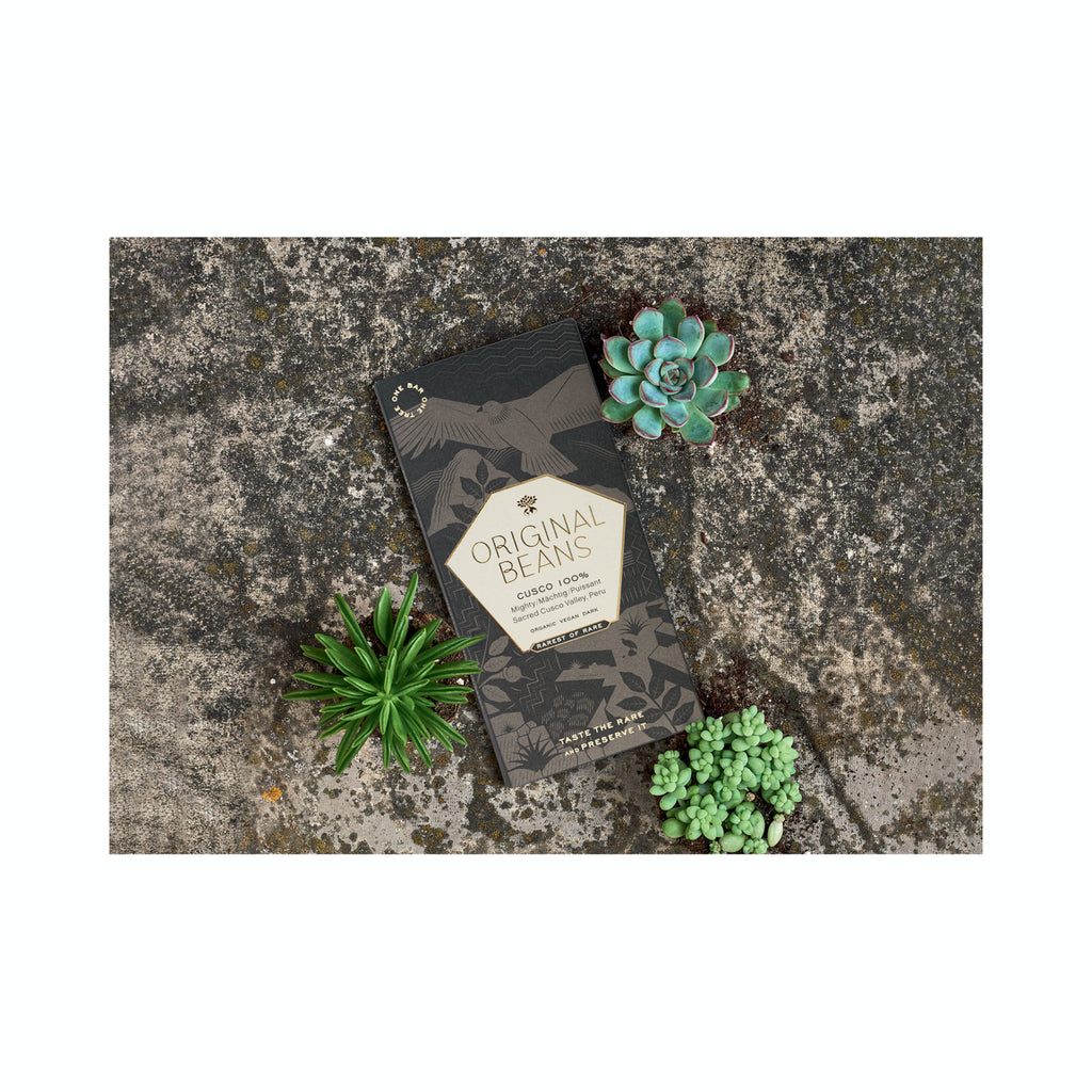 "Original beans are a climate positive company who specialise in sourcing rare cacao beans and support conservation projects. For every bar bought they plant one tree - track it with the code on pack. Tastes of dried flowers and grass mark the absolute altitude of this rarest of rare Chuncho cacao, a singular offering from the lands of the mighty condor. Comes in Plastic Free Packaging."