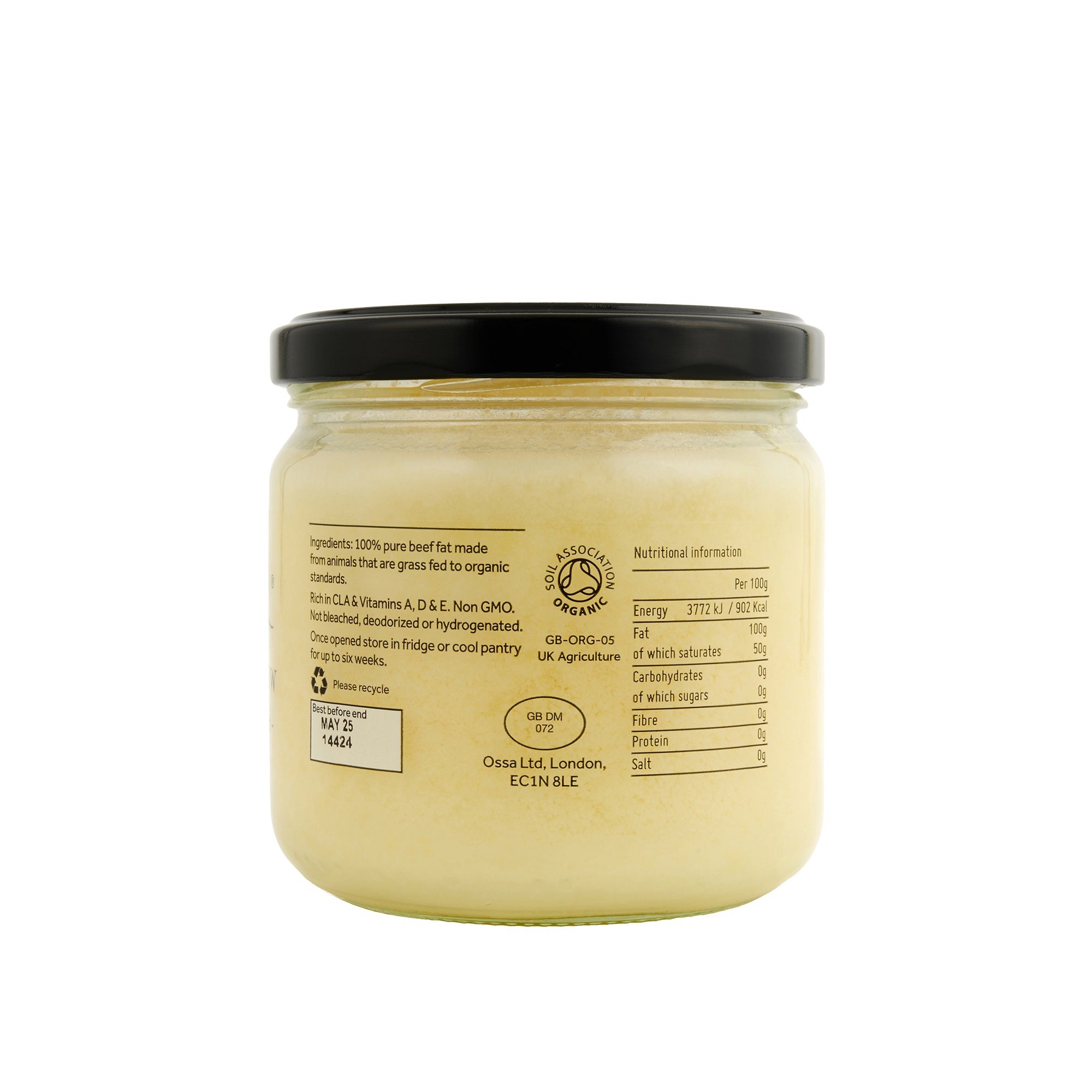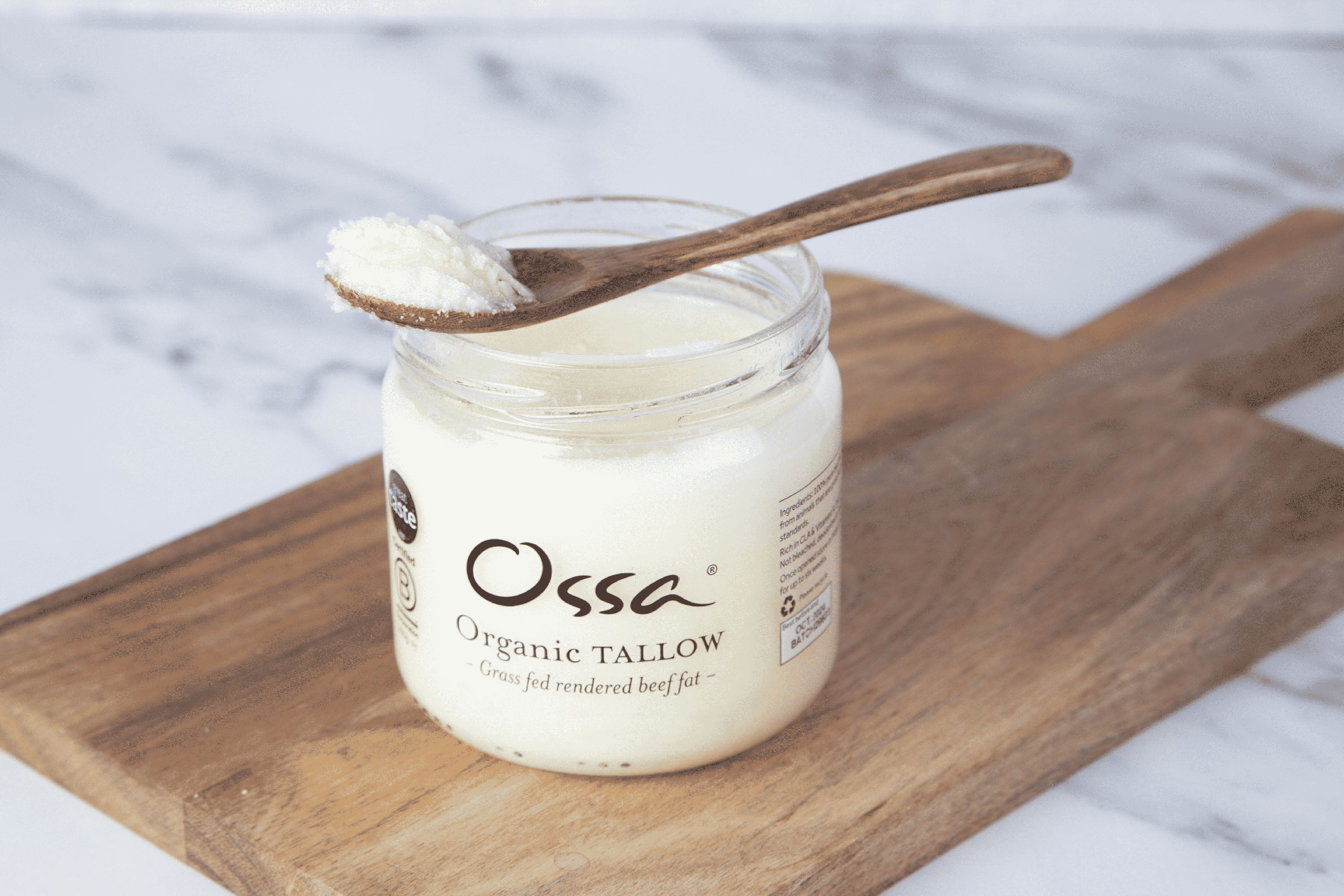 "100% pure organic beef fat made from gras- fed, organically reared cattle. Rich in CLA & Omega 3s. Non GMO. Not bleached, deodorized or hydrogenated. An excellent source of clean, natural energy for the body with a high smoke point perfect for cooking and frying."