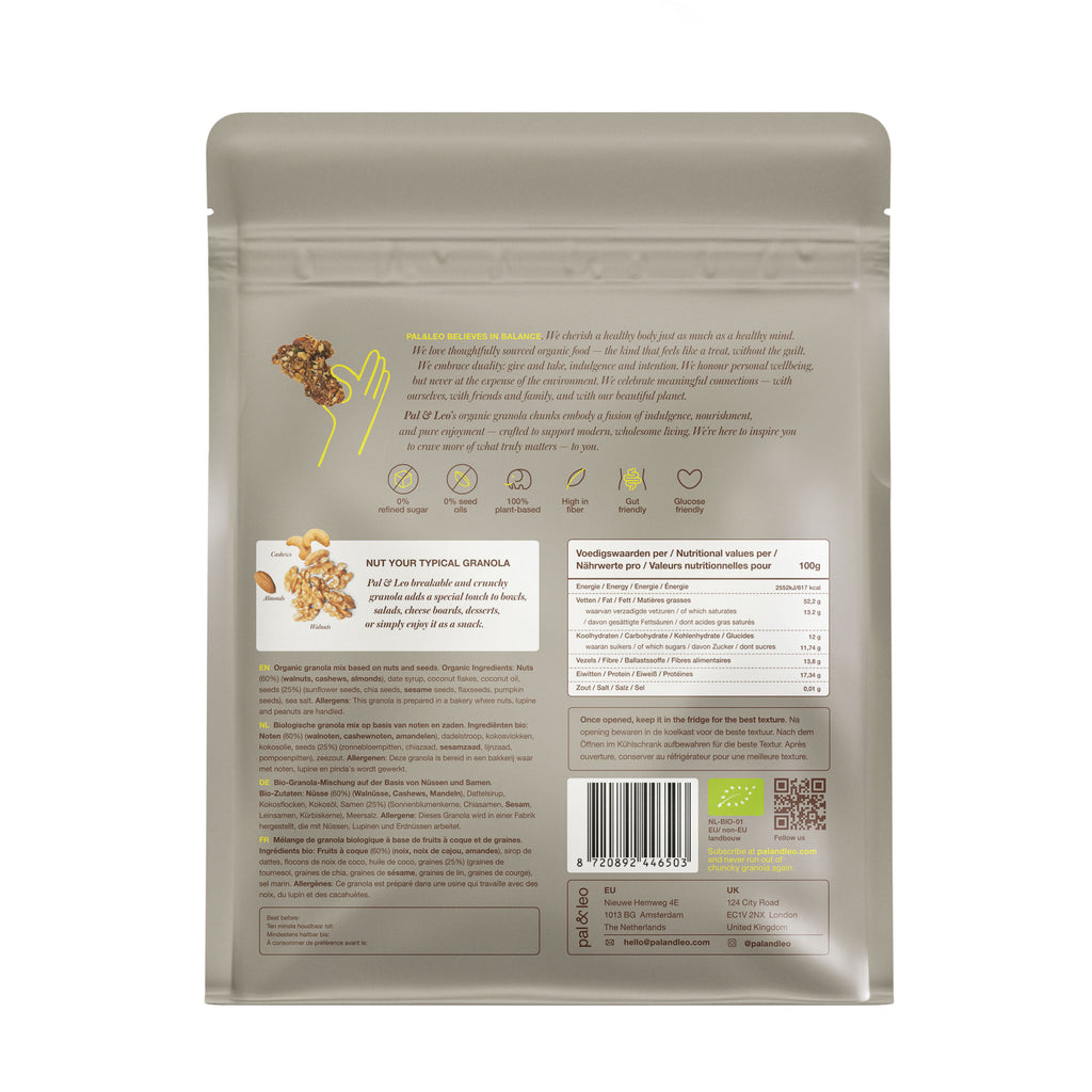 "These organic and delicious granola chunks are made to elevate your everyday moments.Crafted with care using only the finest organic, plant-based ingredients, they offer a rich, nutty flavor and satisfying crunch in every bite. Naturally gluten-free and made exclusively from nuts and seeds — with no grains or cereals — they’re as versatile as they are tasty.Enjoy them on a yogurt bowl, as a flavorful topping for soups and salads, a crunchy twist in place of croutons, or as a gourmet bite on a cheese board. Or simply snack on them straight from the bag — no rules, just uncompromising quality and taste."