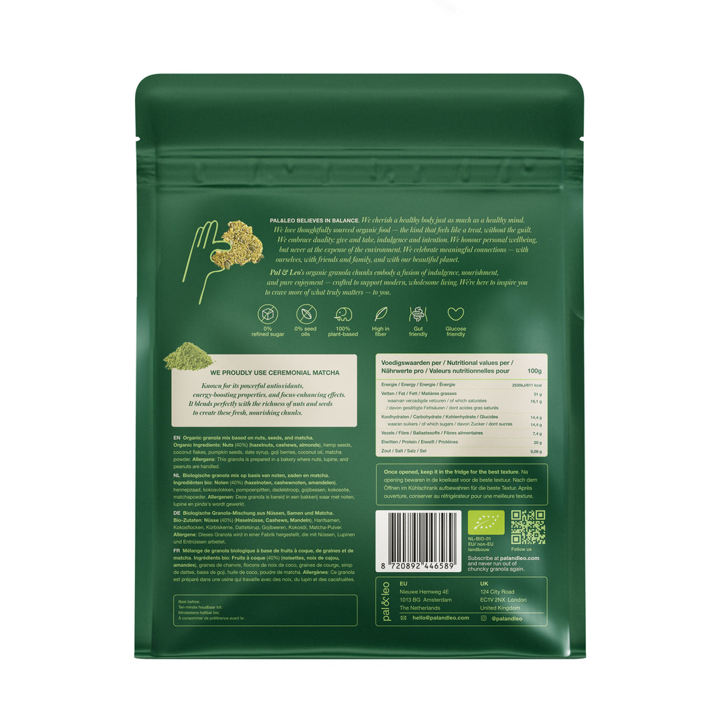 "These organic and delicious matcha granola chunks are made to elevate your everyday moments.Crafted with care using only the finest organic, plant-based ingredients, they offer a rich, nutty flavor and satisfying crunch in every bite. Naturally gluten-free and made exclusively from nuts and seeds — with no grains or cereals — they’re as versatile as they are tasty.Enjoy them on a yogurt bowl, as a flavorful topping for ice creams, or simply snack on them straight from the bag — no rules, just uncompromising quality and taste."