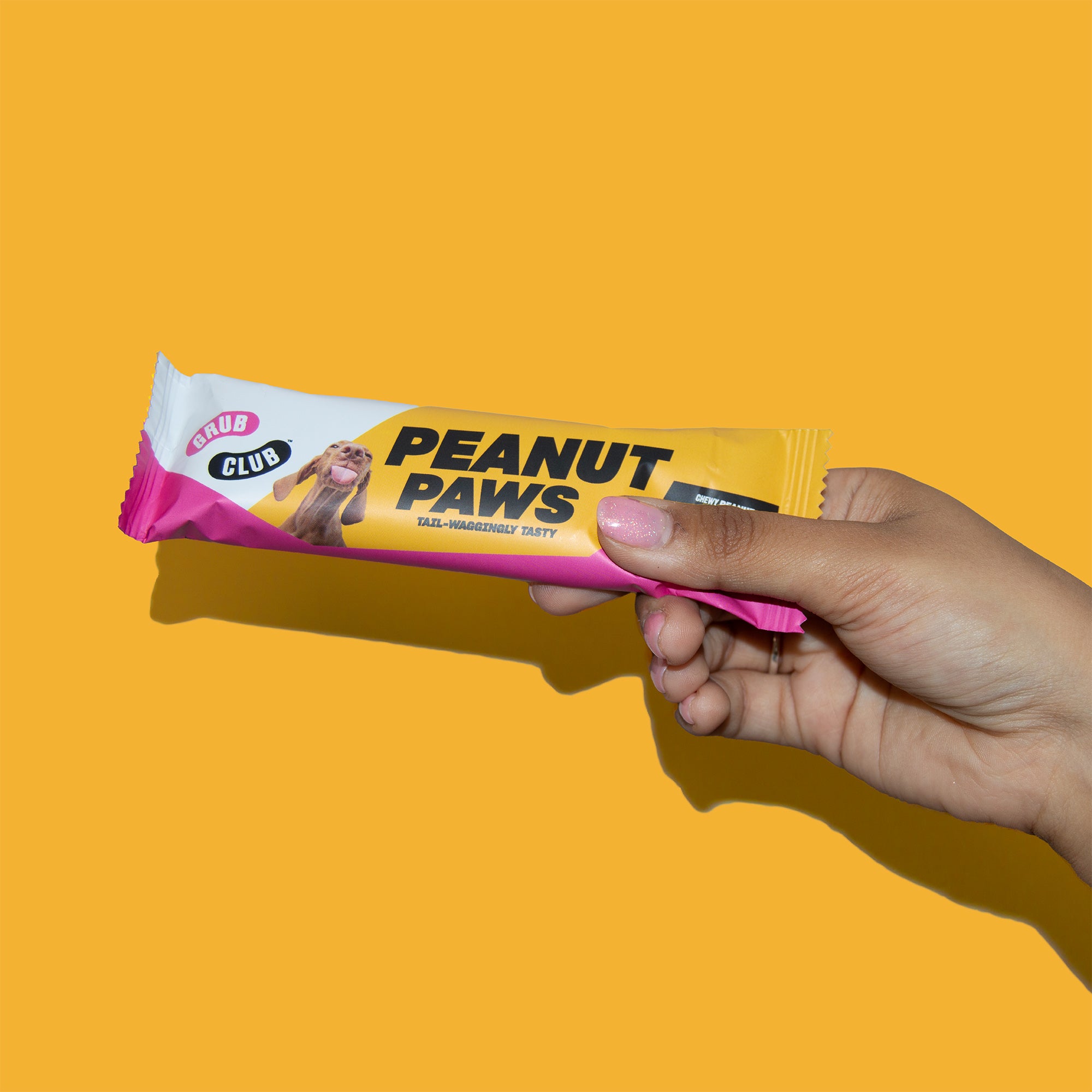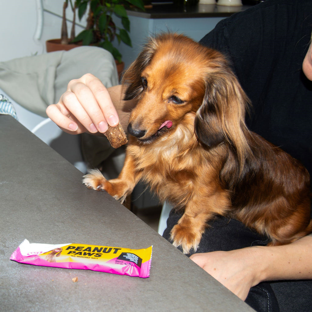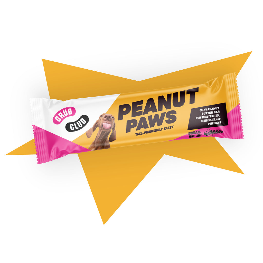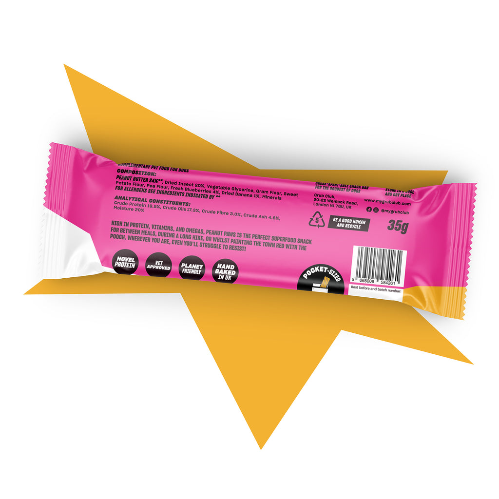 "Chewy peanut butter bar with insect protein, blueberries, and prebiotics. High in protein, vitamin E, and Omegas, Peanut Paws is the perfect superfood snack for between meals, during a long walk, or whilst painting the town red with the pooch."