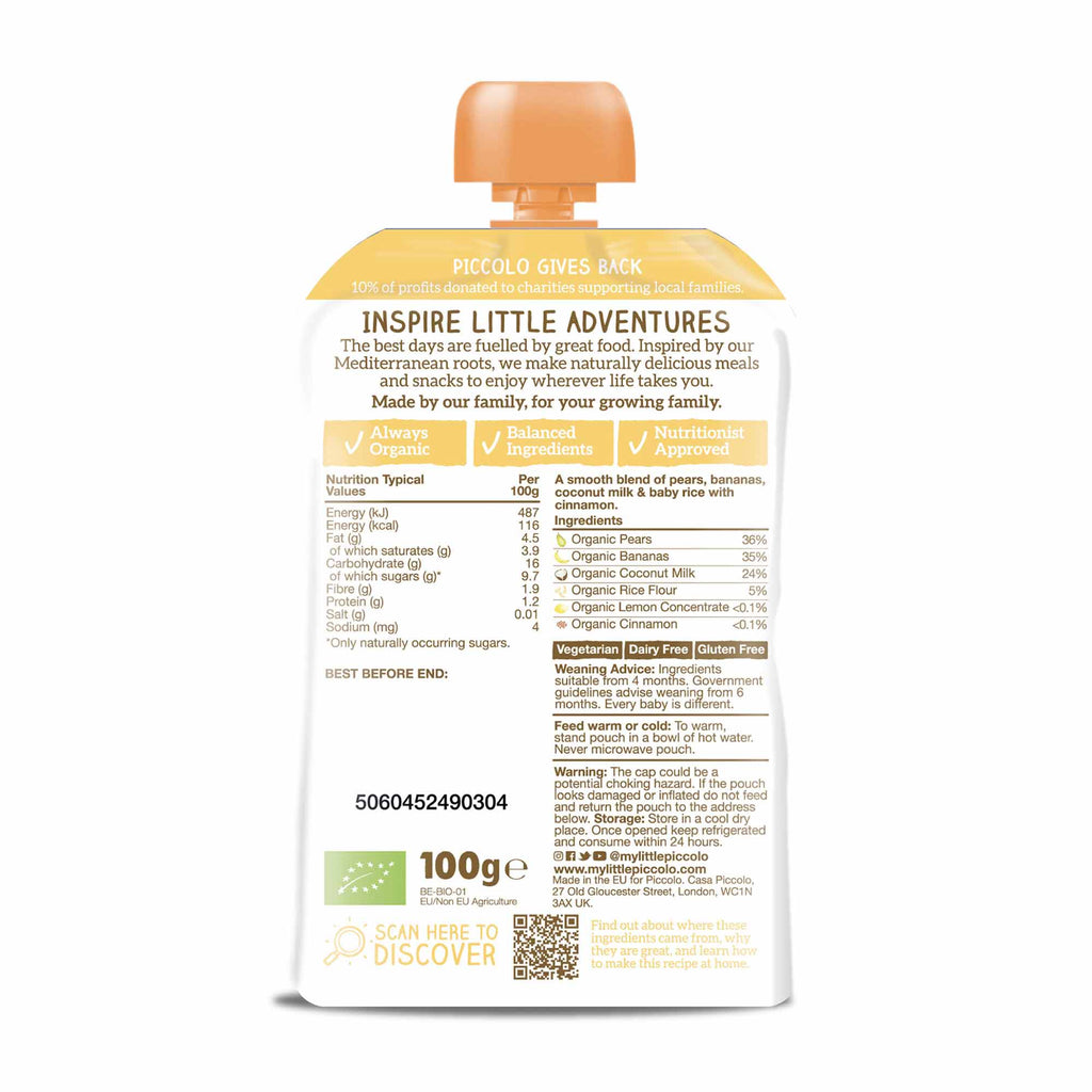 "This delicious creamy banana and coconut milk puree with baby rice makes a delicious breakfast or snack. At Piccolo, we are on a mission to encourage healthy eating from a young age by broadening little one’s taste buds through exciting new flavours whilst giving 10% of our profits to food education in partnership with the National Childbirth Trust (NCT). This smooth blend of organic fruit contains no added sugar, no nonsense or anything artificial and draws inspiration from the Mediterranean approach to health and well-being. We believe that introducing a pinch of Mediterranean goodness helps develop your little Piccolo's taste buds from when it matters most. We choose our suppliers with the greatest care, working directly with farmers to ensure that we know exactly what goes inside every one of our Piccolo pouches ensuring the best quality ingredients from farm to fork (or spoon!)"