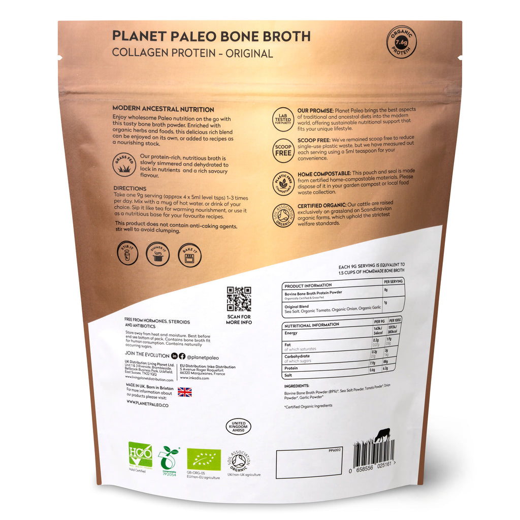 "Bone broths have been a staple of traditional diets all over the world for thousands of years. Planet Paleo have brought bone broth back into the modern world, with a quick and delicious way to obtain this ancient healing food.Planet Paleo Organic Bone Broth is crafted from the highest quality organic grass-fed cattle in Scandinavia, slowly simmered to release all the powerful primal nutrients and dehydrated into a convenient, easy to use form.Pure Organic Bone Broth provides a unique nutritional profile containing collagen protein, glucosamine, hyaluronic acid and an abundance of minerals to support whole-body health."