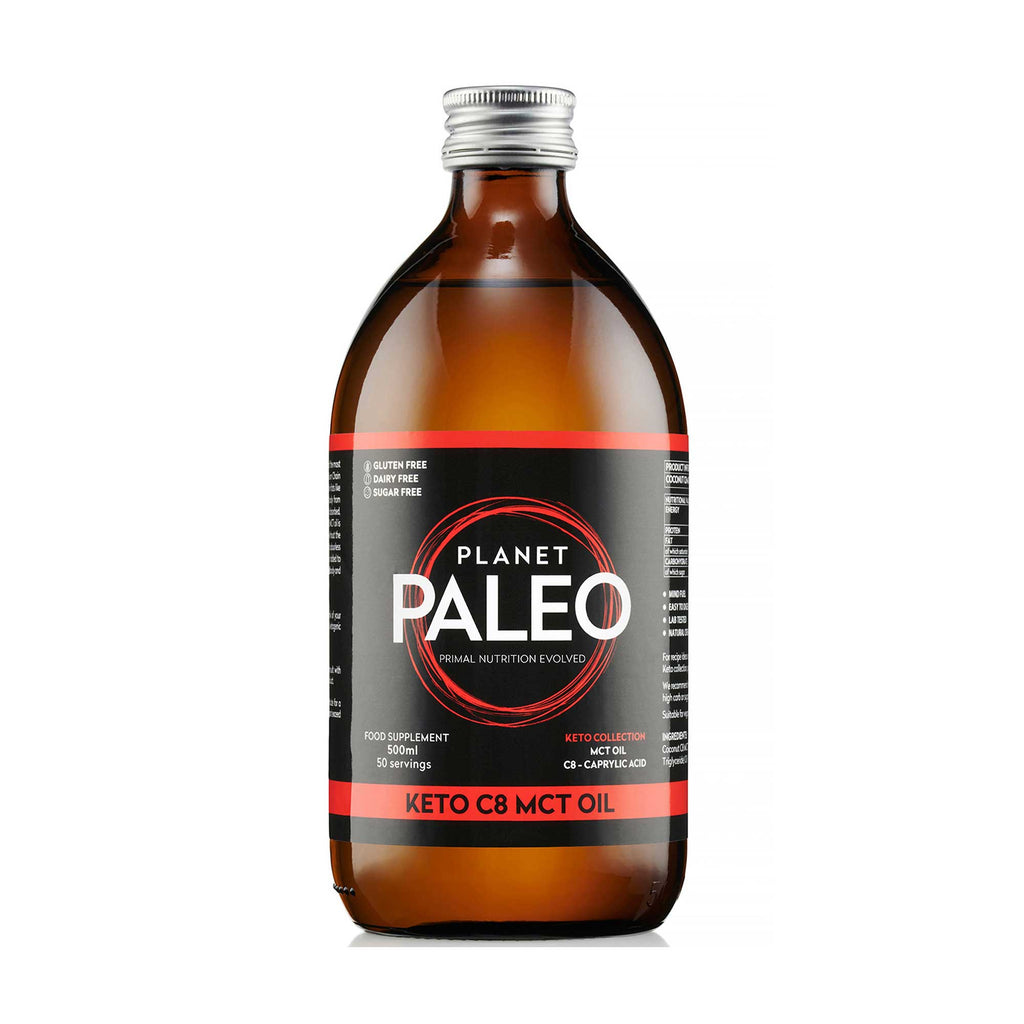 "Planet Paleo Keto C8 MCT Oil, is highly concentrated source of the most metabolically active and ketogenic medium chain triglyceride caprylic acid (C8). Medium chain triglycerides are found in fats like coconut oil and are rapidly broken down and absorbed into the body providing fast fuel for the brain and body. Sourced from coconuts, and extracted without the use of solvents and chemicals, this tasteless and odourless oil can be added as a creamer to your morning coffee or as a booster to smoothies and baked goods. Convenient, fuss free, and easily digestible."
