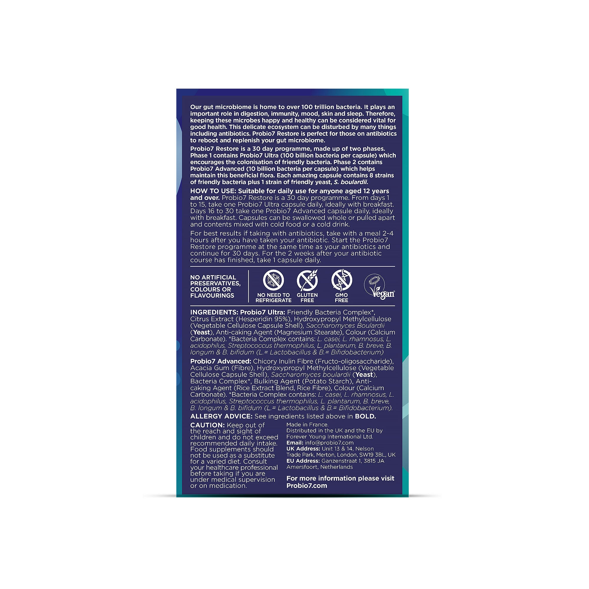 Probio7 Restore is a 30-day programme to protect the balance of your gut microbiome during an antibiotic usage made up of two phases: Phase 1 (the first 15 days) is taken be taken during your antibiotic to replenish your gut microbiome with good bacteria. Phase 2 (the remaining 15 days) is to be taken after your antibiotics have finished to help return your gut microbiome to its former state.