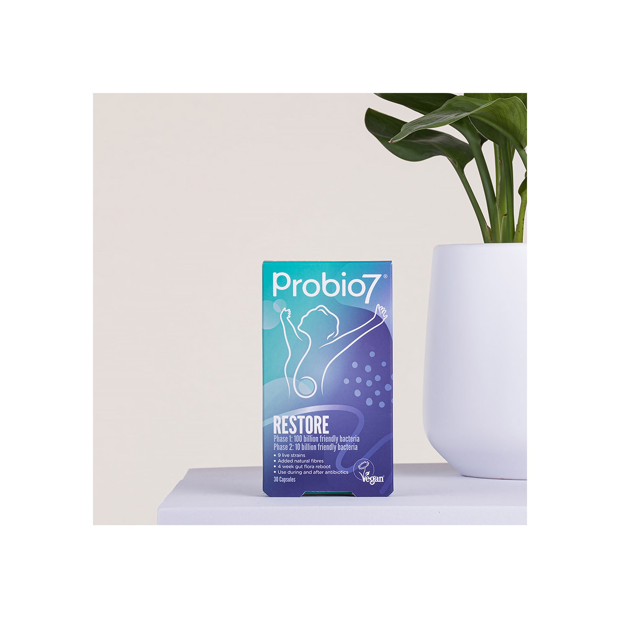 Notify Me When AvailableProbio7 Restore is a 30-day programme to protect the balance of your gut microbiome during an antibiotic usage made up of two phases: Phase 1 (the first 15 days) is taken be taken during your antibiotic to replenish your gut microbiome with good bacteria. Phase 2 (the remaining 15 days) is to be taken after your antibiotics have finished to help return your gut microbiome to its former state.