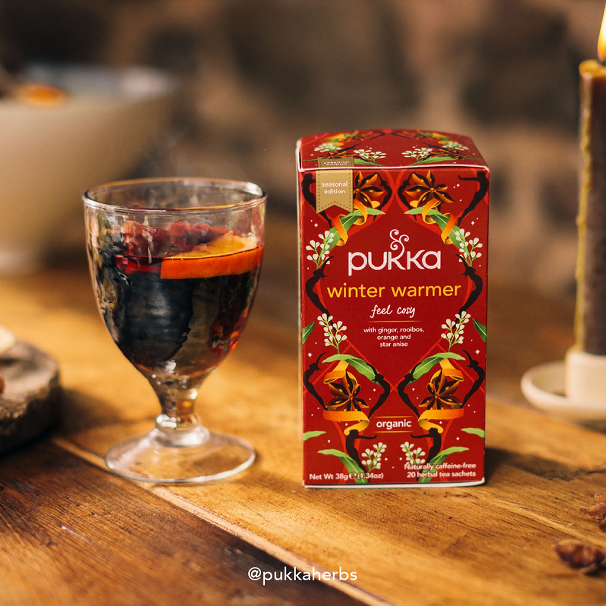 "Wrap yourself up in an organic swirl of warmth. Golden ginger, sweet orange with the caffeine free embrace of fair rooibos and star anise for a true herbal glow"