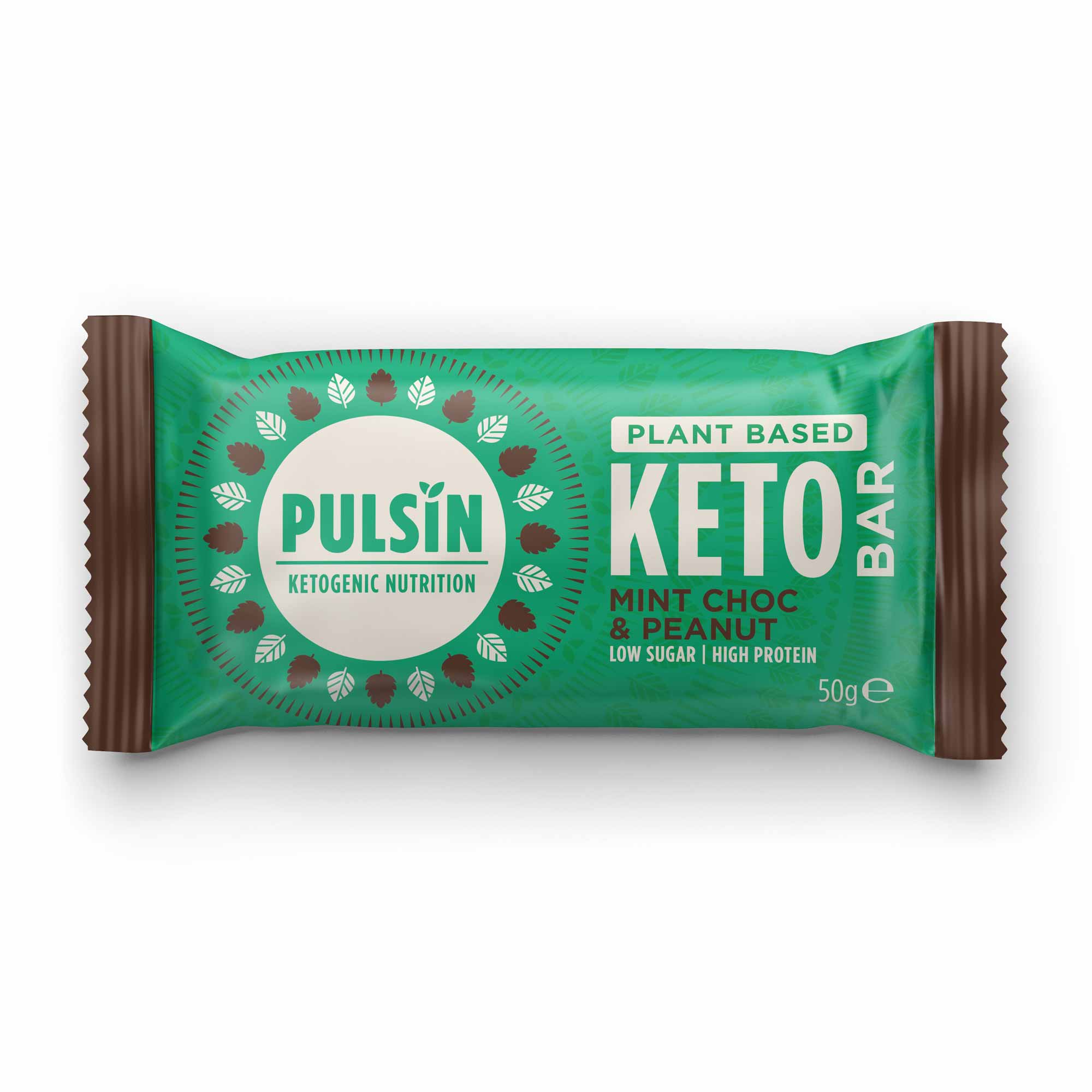 "Pulsin's delicious Mint Choc & Peanut Keto Bar contains 13 grams of plant based protein and is packed full of crunchy peanuts and no added sugar chocolate chips. It also contains MCT, a ketone boosting fat, making it the perfect on-the-go snack for those following a keto or low-carb diet."