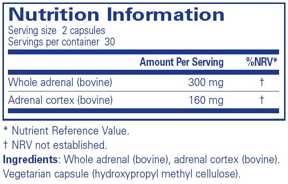 "Adrenal provides a blend of whole adrenal and adrenal cortex extracts. Each capsule provides 460mg of total adrenal concentrate and is free-free from additives, binders and fillers."