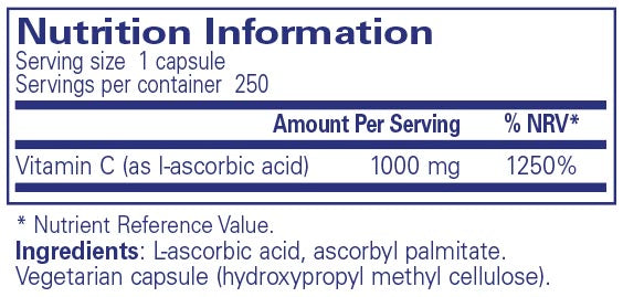 Ascorbic Acid provides natural vitamin C (ascorbic acid) in a professional-strength 1000 mg capsule. Vitamin C contributes to the normal function of the immune system and normal psychological function and functioning of the nervous system. Contributes to the reduction of tiredness and fatigue.