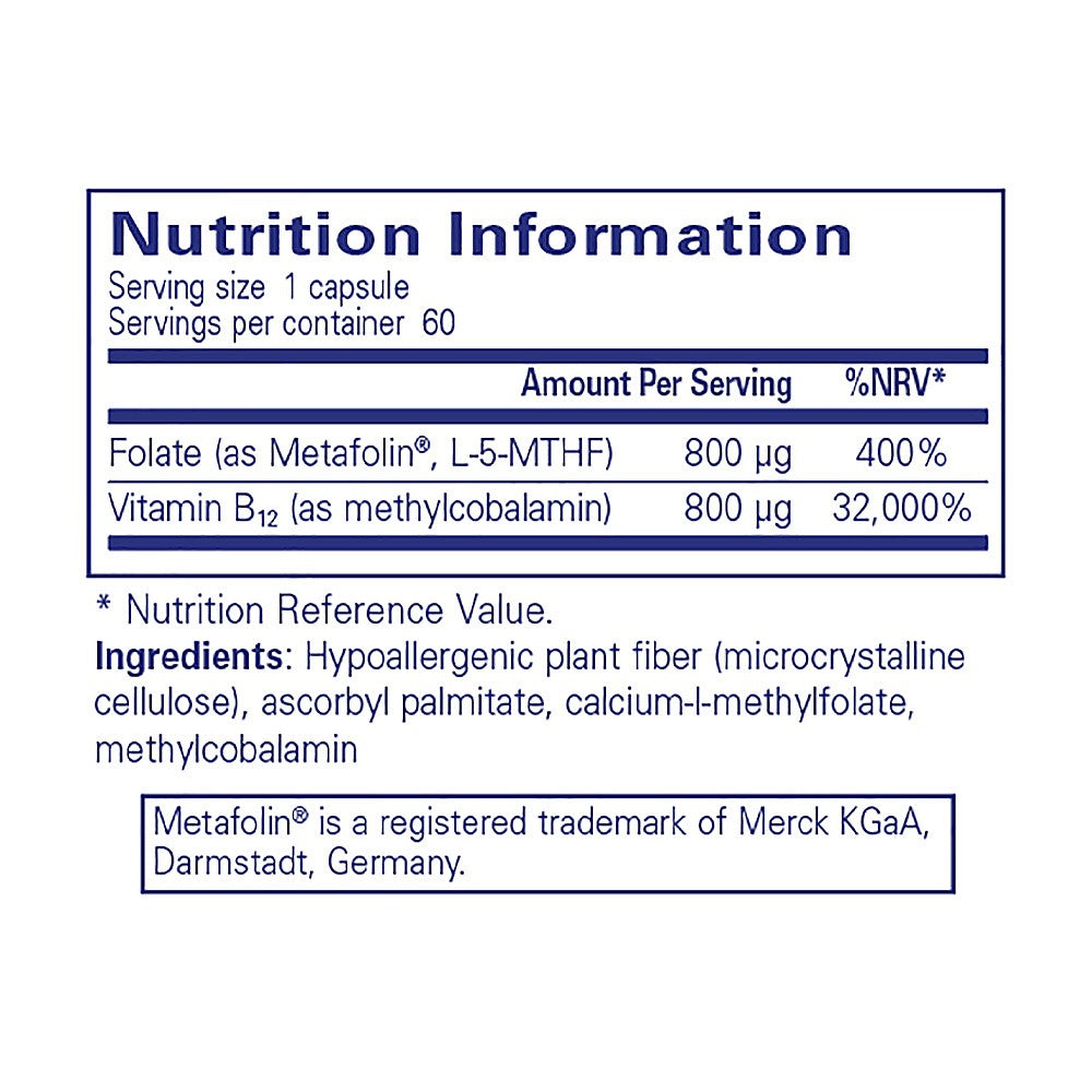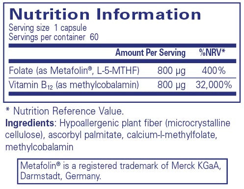 "Activated vitamin B12 and folate features B12 as methylcobalamin and folate as L-5-methyltetrahydrofolate (L-5-MTHF), the naturally occurring universally metabolized form of folate. Vitamin B12 and folate have complementary biological activities and are interrelated in function. Vitamin B12 & folate contribute to normal psychological function. Vitamin B12 & folate contribute to normal homocysteine metabolism."