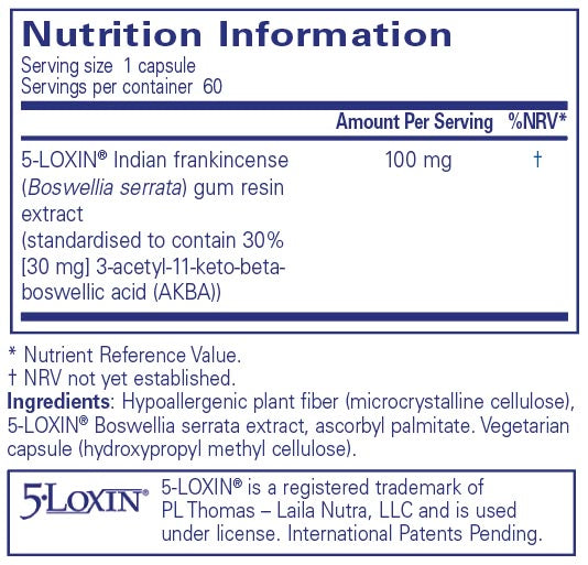 Boswellia AKBA contains 5-LOXIN® a clinically studied boswellia extract providing ten times as much AKBA as typical boswellia extracts. AKBA (3-acetyl-11-keto-beta-boswellic acid) has been identified as one of the most active phytonutrients in Boswellia serrata.