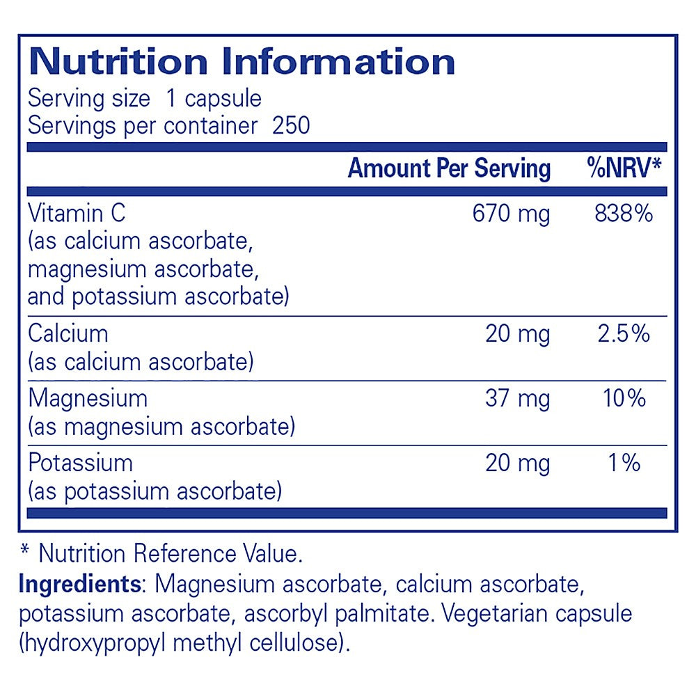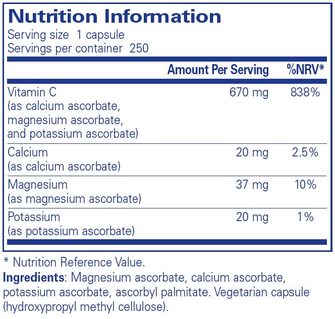 "Buffered Ascorbic Acid combines calcium ascorbate, magnesium ascorbate, and potassium ascorbate to create a neutral pH vitamin C for sensitive individuals. Vitamin C contributes to normal psychological function and functioning of the nervous system. Vitamin C contributes to the reduction of tiredness and fatigue. "
