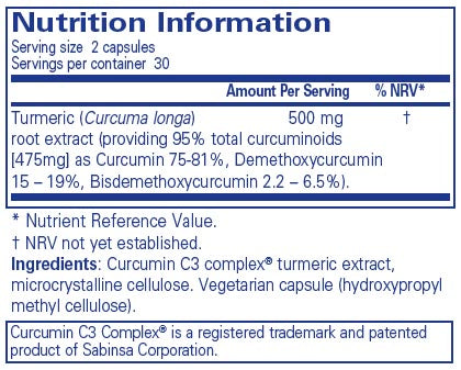 "Turmeric has a long history of traditional use and has undergone much modern research. Curcuminoids, including curcumin, are some of the main active phytonutrients in turmeric. Curcumin C3 Complex® is high potency turmeric extract providing a full spectrum of curcuminoids."