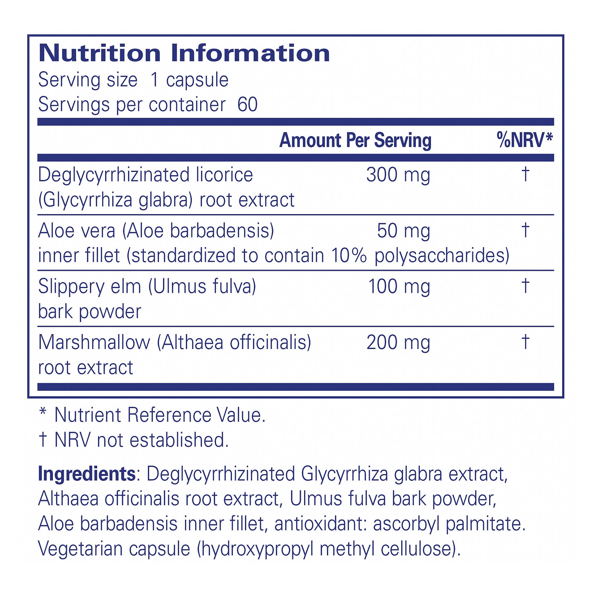 "Licorice root extract with aloe, slippery elm and marshmallow. DGL Plus features deglycyrrhizinated licorice (DGL) root extract. Provides 300 mg of DGL in each vegetarian capsule. With aloe inner leaf extract. Also providing slippery elm and marshmallow."
