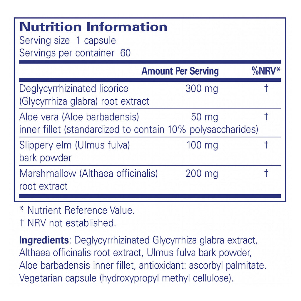 Notify Me When Available"Licorice root extract with aloe, slippery elm and marshmallow. DGL Plus features deglycyrrhizinated licorice (DGL) root extract. Provides 300 mg of DGL in each vegetarian capsule. With aloe inner leaf extract. Also providing slippery elm and marshmallow."