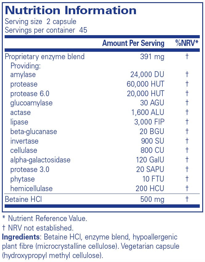 "Digestive Enzymes Ultra with Betaine HCl contains a high-strength, broad-spectrum mixture of vegetarian digestive enzymes with Betaine HCl. This comprehensive formula provides enzymes that are involved in the digestion of protein, carbohydrate, fat, fiber and lactose. Betaine HCl is an acidic form of betaine, and pepsin is a protein-digesting enzyme"