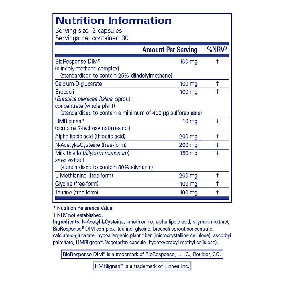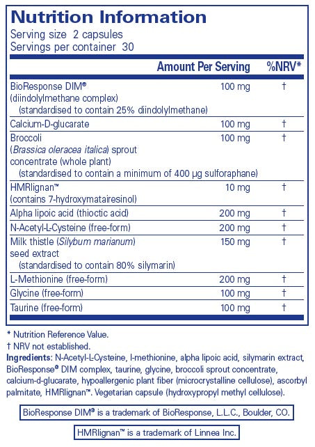 "DIM Ultra features BioResponse DIM® with phytonutrients, milk thistle, lipoic acid and amino acids for advanced nutritional support. BioResponse DIM® is a highly absorbable form of diindolylmethane, an important metabolite of indole-3-carbinol.With the lignan 7-hydroxymatairesinol (HMR), which is converted in the body to enterolactone. Also featuring Broccoli sprout concentrate with a guaranteed level of sulforaphane. Provides silymarin, alpha lipoic acid and n-acetyl-l-cysteine. With the amino acids taurine, glycine and methionine. "