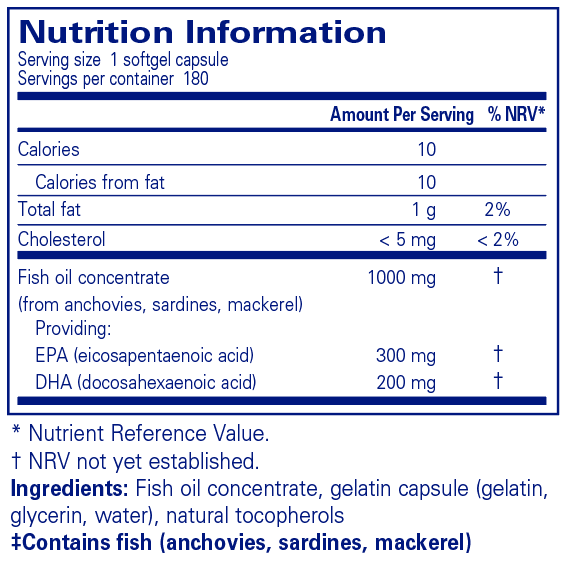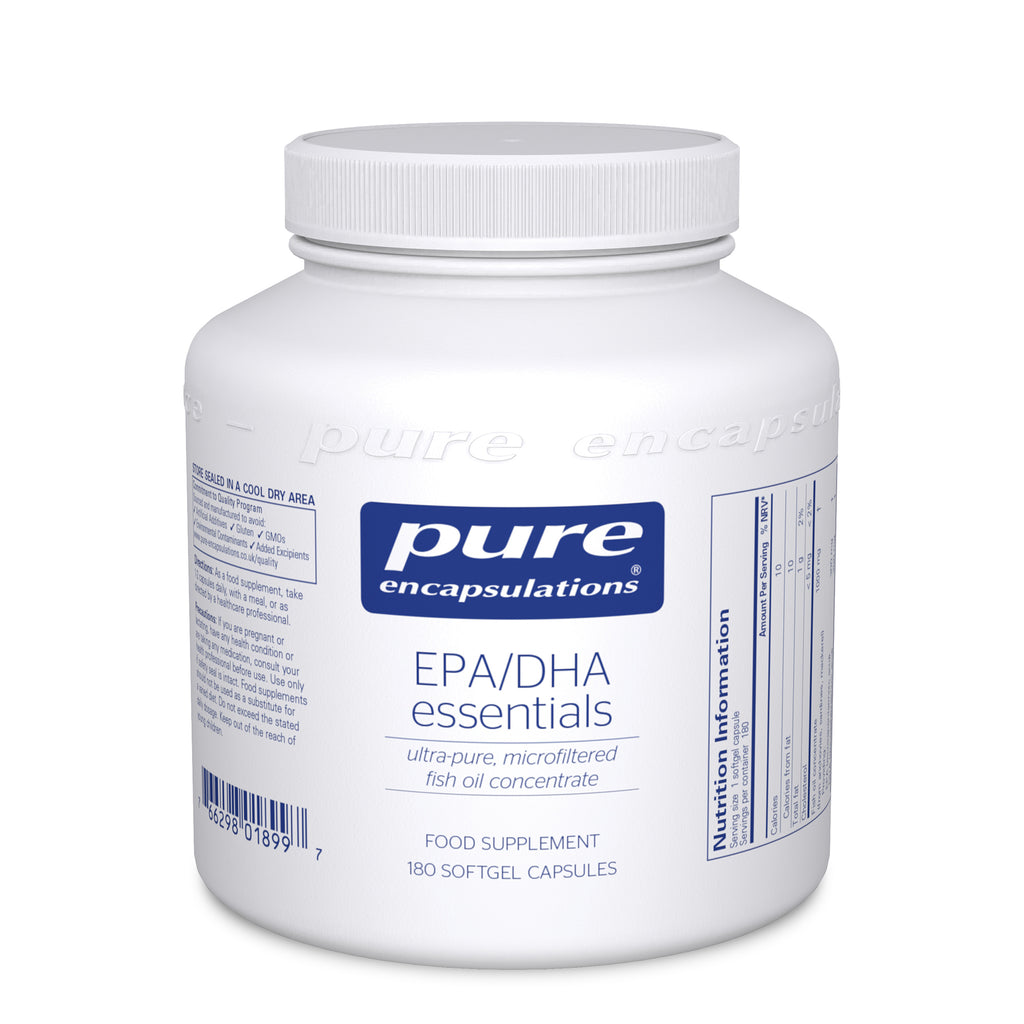 "Pure Encapsulations EPA/DHA Essentials is an ultra-pure, molecularly distilled fish oil concentrate that has been tested for environmental contaminants (heavy metals, PCBs, dioxins and furans), microbial contaminants, and oxidation and rancidity. It contains well below the strict limits for these criteria as established by the Council for Responsible Nutrition (CRN), Europea Pharmacoepeia (EP) and U.S. Pharmacoepeia (USP). DHA contributes to maintenance of normal vision and brain function. EPA and DHA contribute to the normal function of the heart."