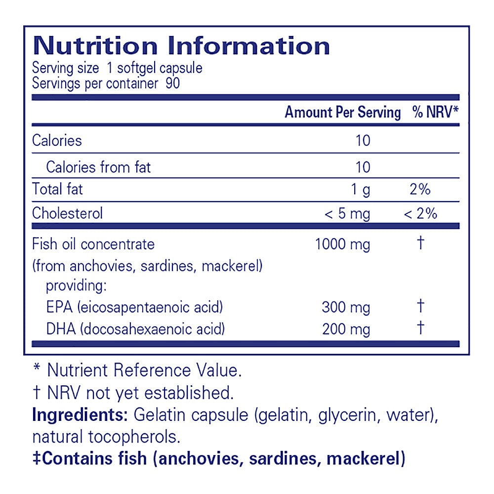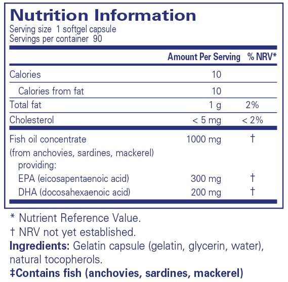 "EPA/DHA essentials is an ultra-pure, molecularly distilled fish oil concentrate that has been tested for environmental contaminants (heavy metals, PCBs, dioxins and furans), microbial contaminants, and oxidation and rancidity. It contains well below the strict limits for these criteria as established by the Council for Responsible Nutrition (CRN), Europea Pharmacoepeia (EP) and U.S. Pharmacoepeia (USP). DHA contributes to maintenance of normal vision and brain function. EPA and DHA contribute to the normal function of the heart."