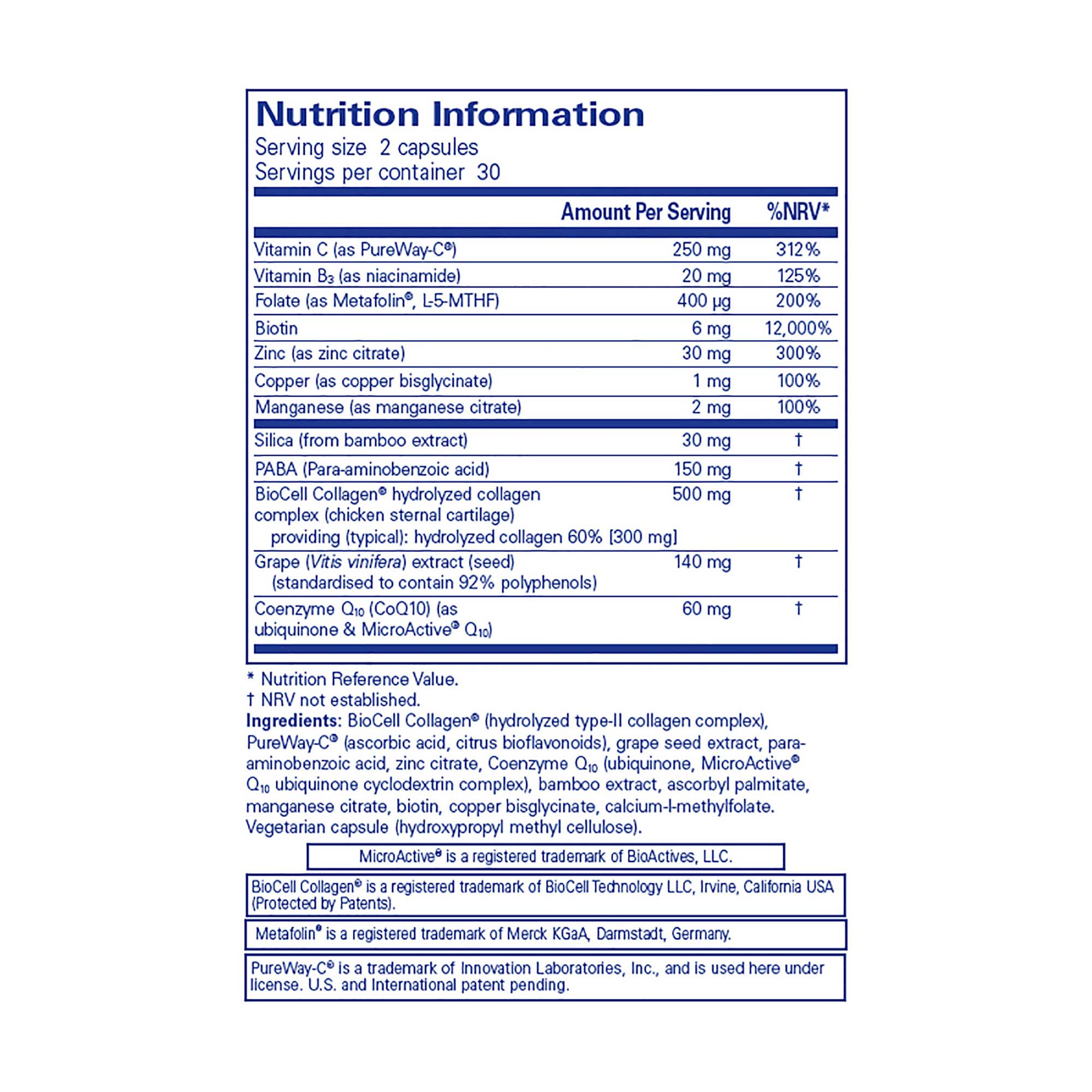 "Pure Encapsulations Hair Skin Nails Ultra with BioCell Collagen® features a comprehensive blend of nutrients that support healthy skin hair and nails. Combines vitamins and trace elements with special bioactive substances in a complete formula for everyday use. Provides nutrients specially selected for their contribution to normal collagen formation, protecting cells from oxidative stress and the maintenance of normal skin, hair and nails."