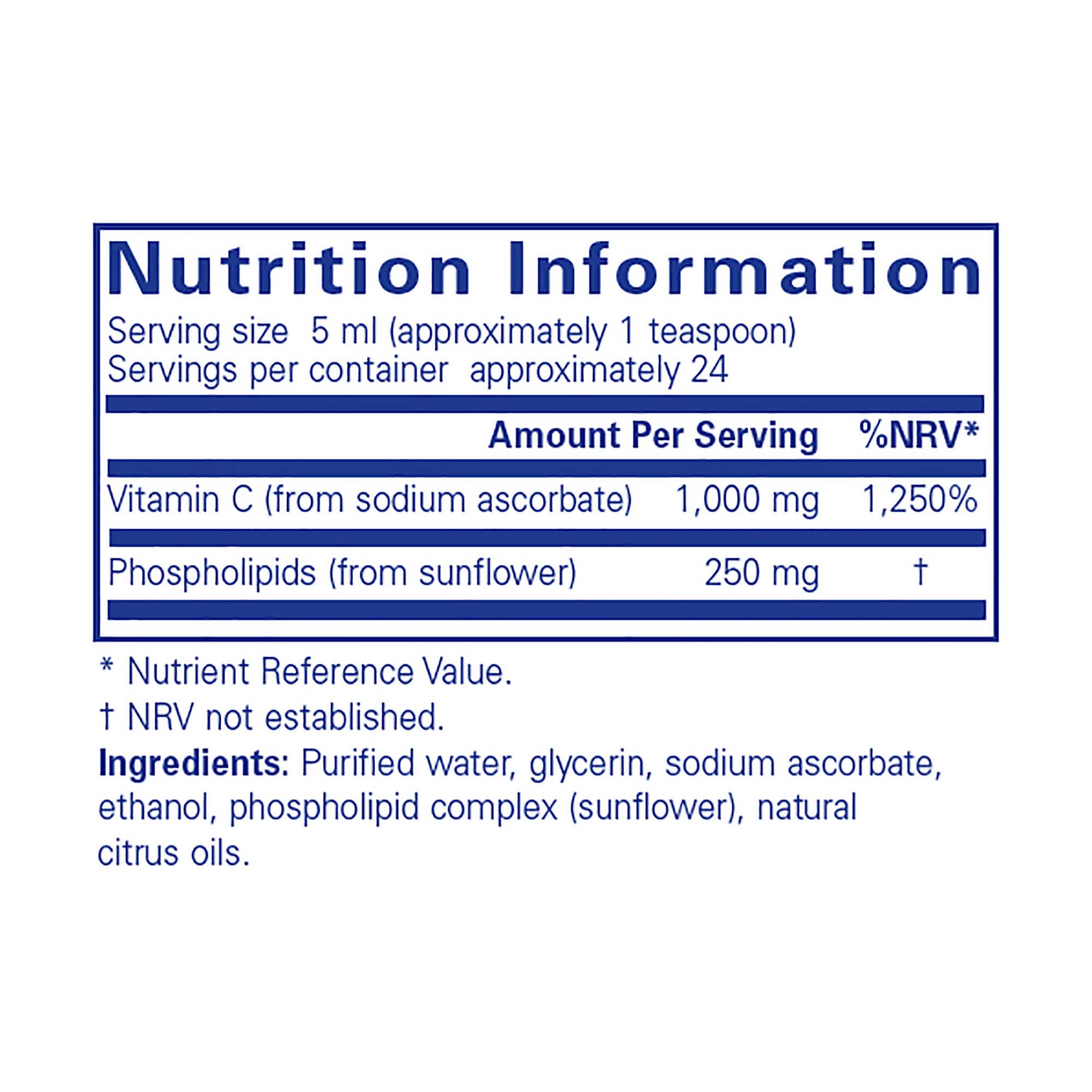 "Liposomal Vitamin C Liquid offers vitamin C in an enhanced-absorption liposomal form. The liposomal delivery system utilizes phospholipids from GMO-free sunflower seeds. All the benefits of this essential vitamin in a pleasant-tasting, citrus-flavoured liquid that provides 1,000 mg of vitamin C per serving (teaspoon)."