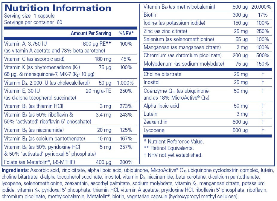 "O.N.E. Multivitamin is a once-daily formula with a comprehensive profile of highly bioavailable vitamins, minerals and phytonutrients and other factors to support optimal nutrition for both men and women. Provides vitamins A, B, C, D, E and K in highly bioavailable forms. With active forms of B vitamins including folate as 5-methyltetrahydrofolate (5-MTHF), the universally metabolized and biologically active form of folate. Provides 2000 IU of vitamin D3 in each vegetarian capsule. Features sustained-release water-soluble CoQ10 as well as the carotenoids lycopene, lutein and zeaxanthin for greater daily nutritional support. Expertly formulated to provide optimal levels of each nutrient. "