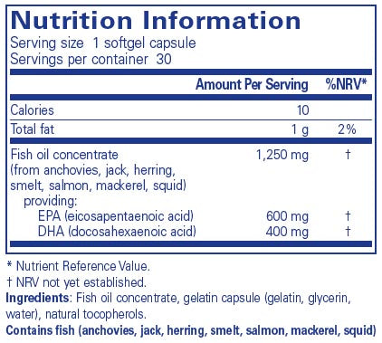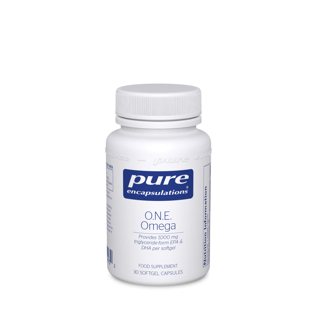 "ONE Omega provides 1,000 mg triglyceride-form EPA and DHA in each softgel. High potency formulation means less capsules are required. Features ultra-pure, molecularly distilled fish oil concentrate that contains well below the strict limits for environmental contaminants (heavy metals, PCBs, dioxins and furans), microbial contaminants, and oxidation and rancidity. DHA contributes to maintenance of normal vision and brain function. EPA and DHA contribute to the normal function of the heart. "