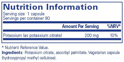 Potassium (citrate) provides potassium as well absorbed and alkaline potassium citrate. Each vegetarian capsule provides 200 mg of potassium as citrate. Potassium contributes to the maintenance of normal blood pressure.
