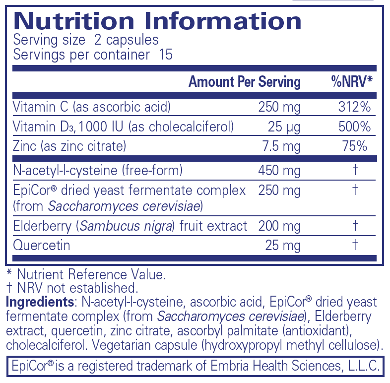 "PureDefense is a targeted blend of nutrients and plant extracts including Vitamin C, D and Zinc which contribute to the normal function of the immune system. Also providing n-acetylcysteine (NAC), EpiCor® dried yeast fermentate complex, Elderberry fruit extract and quercetin. Featuring 450 mg of NAC in each serving of two capsules. EpiCor® is a dried yeast fermentate complex that has undergone published clinical research. Provides 1000 IU (25 ug) vitamin D3 in each serving of two capsules. "