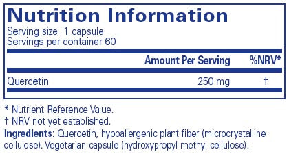 Quercetin features pure quercetin derived from a natural plant source. Quercetin is a flavonoid found in many fruits and vegetables and is one of the most bioactive bioflavonoids. Each vegetarian capsule provides 250 mg of quercetin.