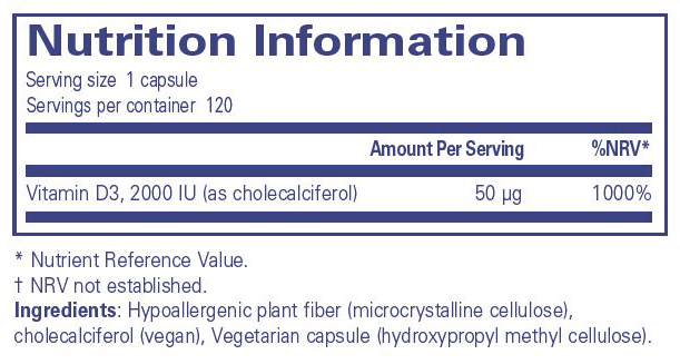 "Vitamin D3 (vegan) 2000 IU (50 ug) provides pure vitamin D as D3, the preferred form of vitamin D. Vitamin D contributes to the maintenance of normal muscle function and normal bones. Vitamin D also contributes to the normal function of the immune system."