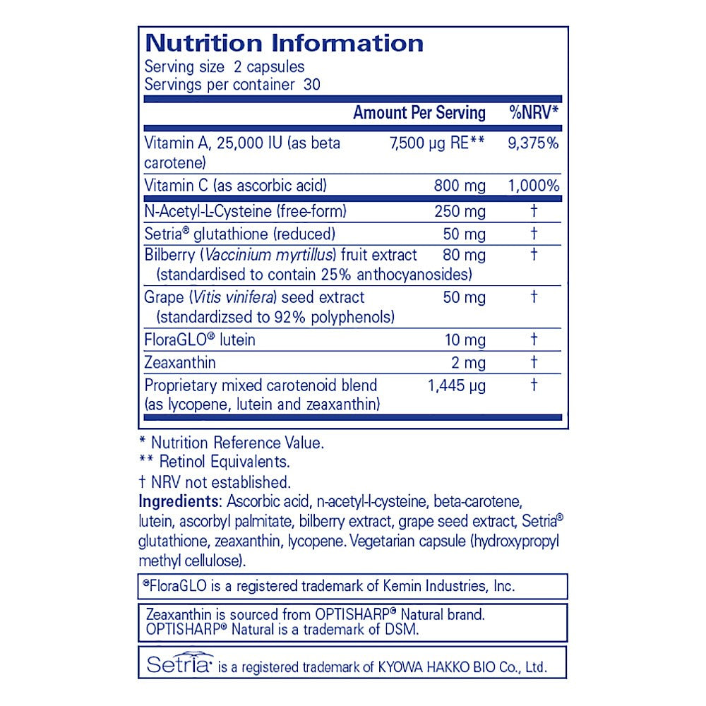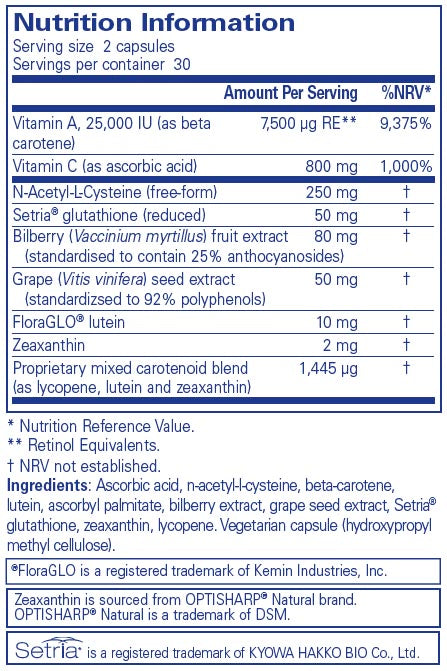 "Vision Support Formula is a blend of powerful nutrients and botanicals formulated with vitamin A to support healthy vision. Featuring lutein and zeaxanthin, the only two carotenoids found in macular pigment. Provides N-acetyl-l-cysteine and Setria® reduced glutathione. With high quality bilberry and grape seed extract. Vitamin C contributes to the protection of cells from oxidative stress"