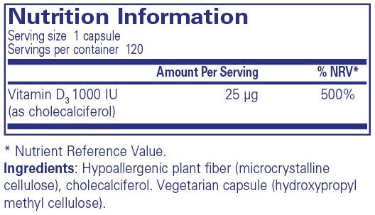"Vitamin D3 1000 IU (25 ug) provides pure vitamin D as D3, the preferred form of vitamin D. Vitamin D contributes to the maintenance of normal muscle function and normal bones. Vitamin D also contributes to the normal function of the immune system."