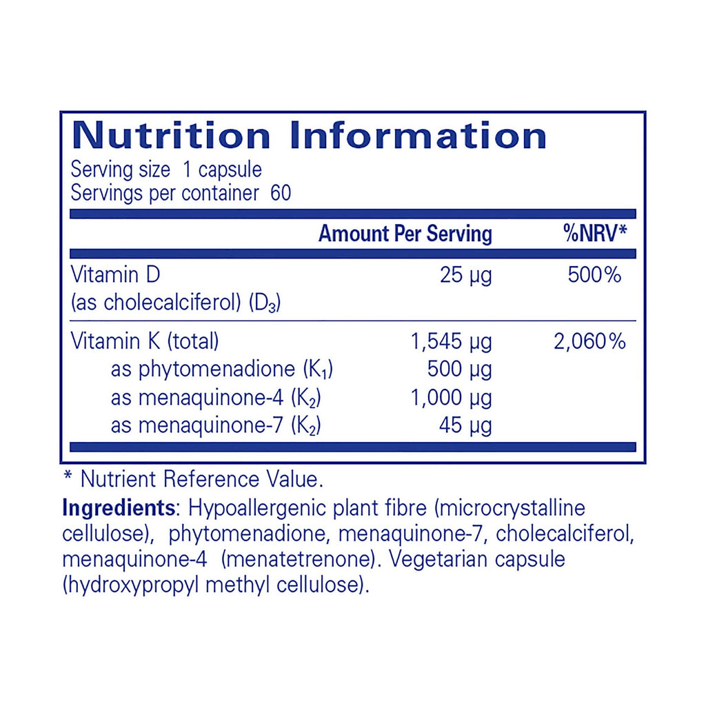 "Pure Encapsulations Vitamin K with D3 is a blend of vitamin K1, vitamin K2 and vitamin D3. Vitamin K and vitamin D have mutually beneficial functions making the combination of these vitamins synergistic. Vitamin K contributes to normal blood clotting. Vitamin D contributes to normal blood calcium levels. Vitamin K and Vitamin D contribute to the maintenance of normal bones. One Capsule provides 1,545 mcg vitamin K and 1000 IU vitamin D3"