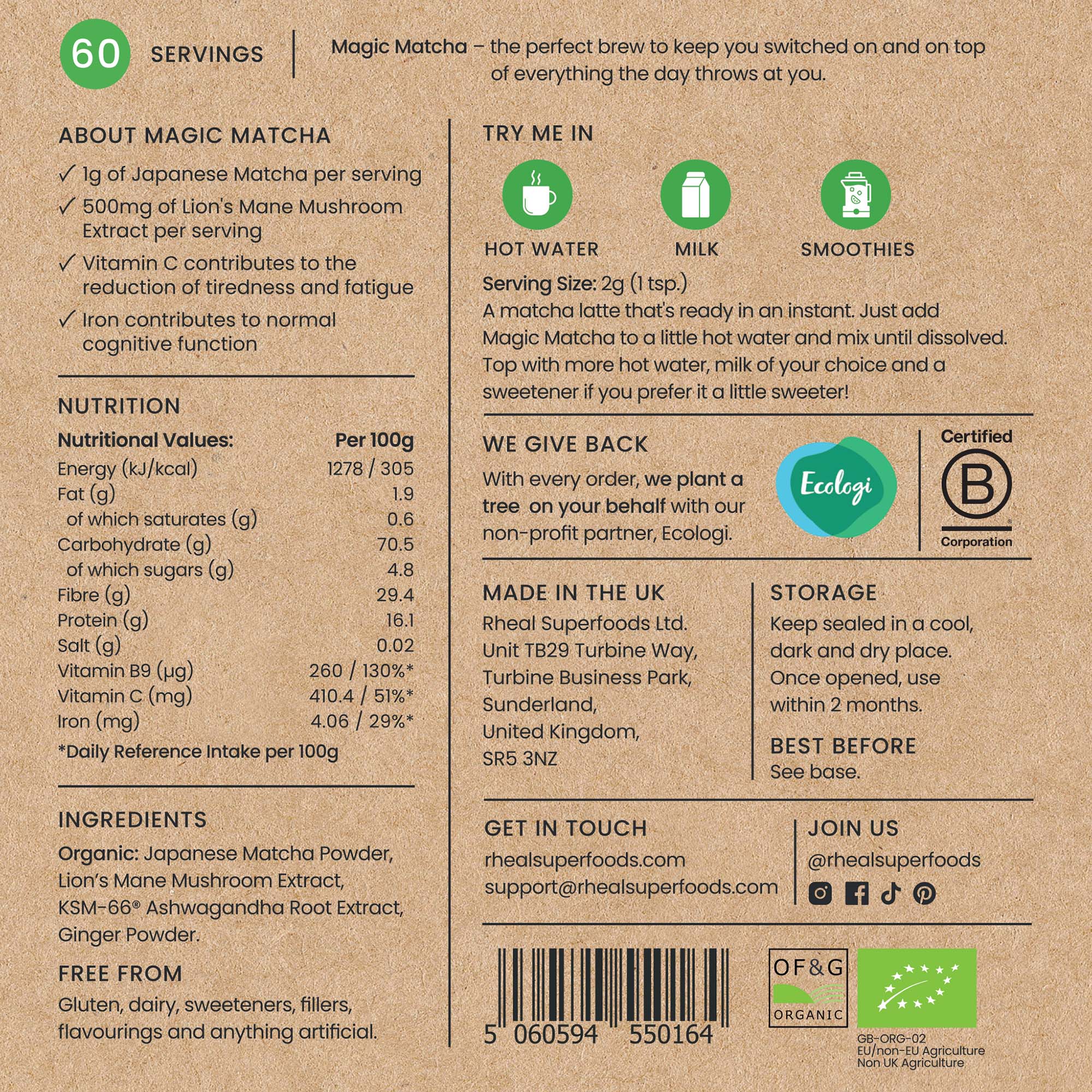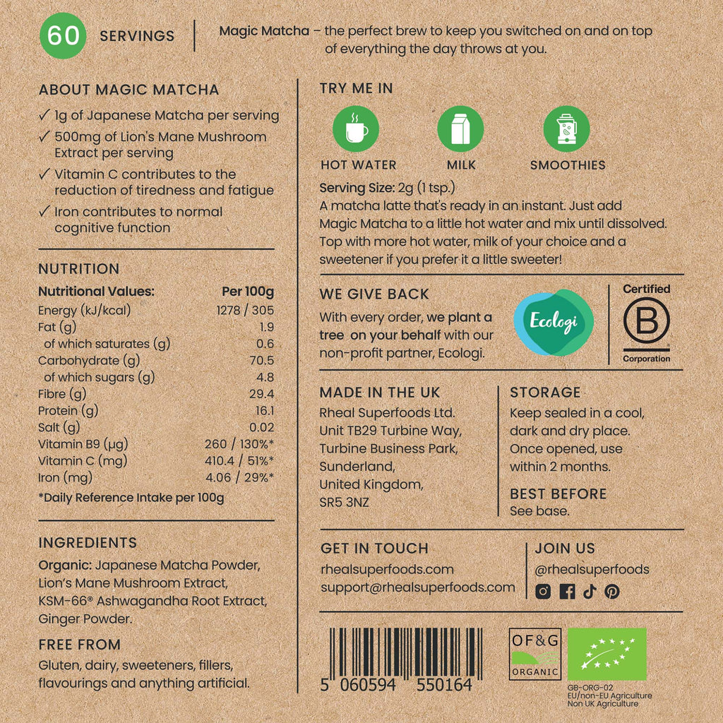 "Avoid feeling burnt out and enjoy a calming brew of matcha with adaptogens, to minimise the effects of stress on the body. Using Japanese Grade Matcha for a delicious & slow release in energy, and 500mg of Lion’s Mane Extract to support better focus with every sip."