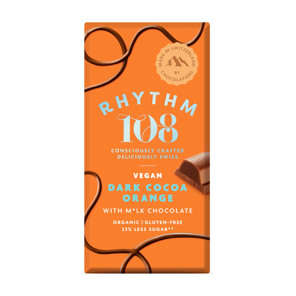 Rhythm 108's all new Swiss M*lk Chocolate tablet with a smooth Dark Cocoa and Orange Truffle Filling. Handmade with lower sugar in Switzerland by their team of dedicated chocolatiers.