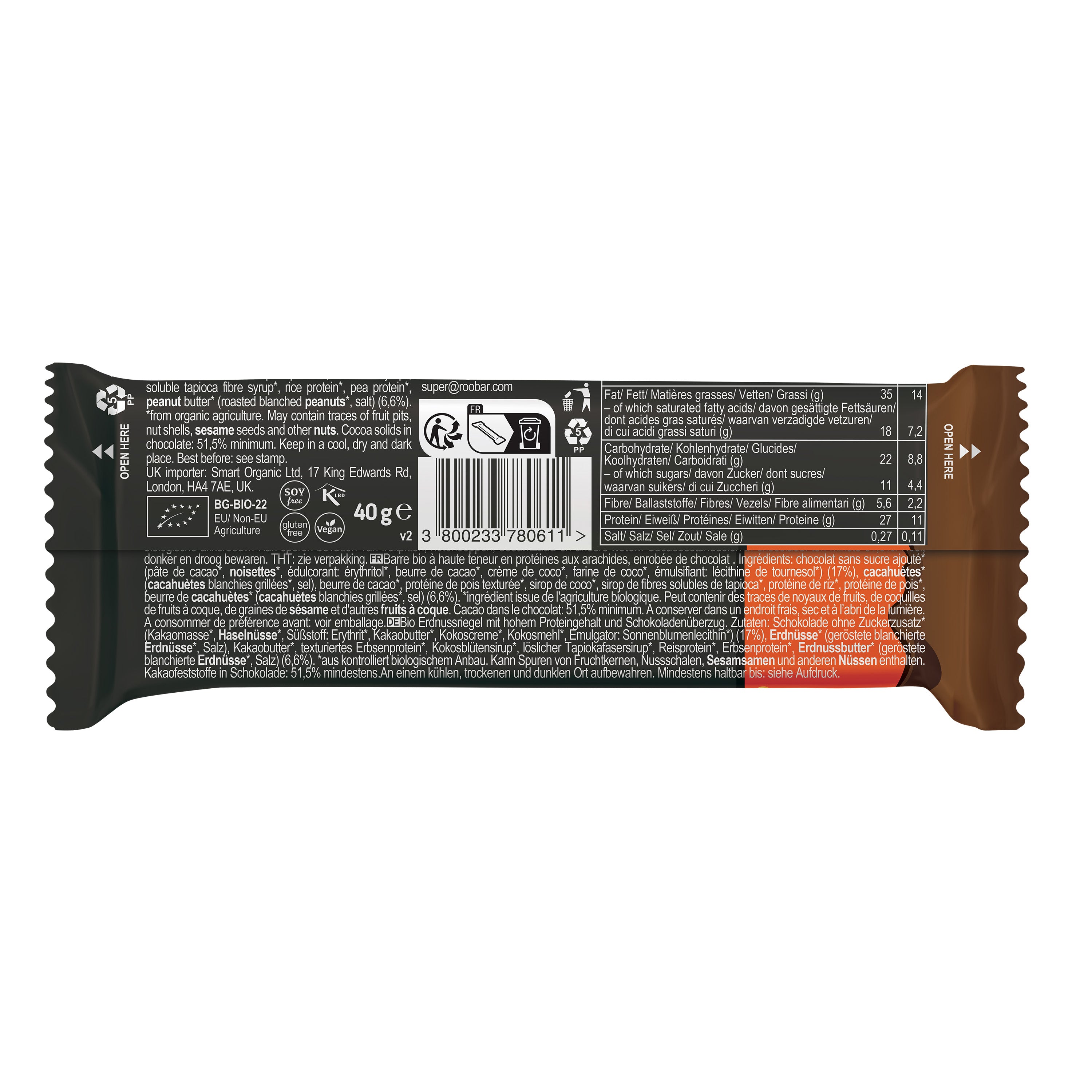 "This NEW bar is the desired expansion to Chocolate Protein RooBars.It is rich in protein and covered in vegan chocolate without added sugar. Roobar Peanut Protein bar contains the optimal combination of rice and pea protein, quickly absorbed by the human body. It has a rich nutty taste and is very nutritious.Crispy and irresistibly delicious, the new Roobar with Peanuts is your new favorite temptation on active and leisurely days!"