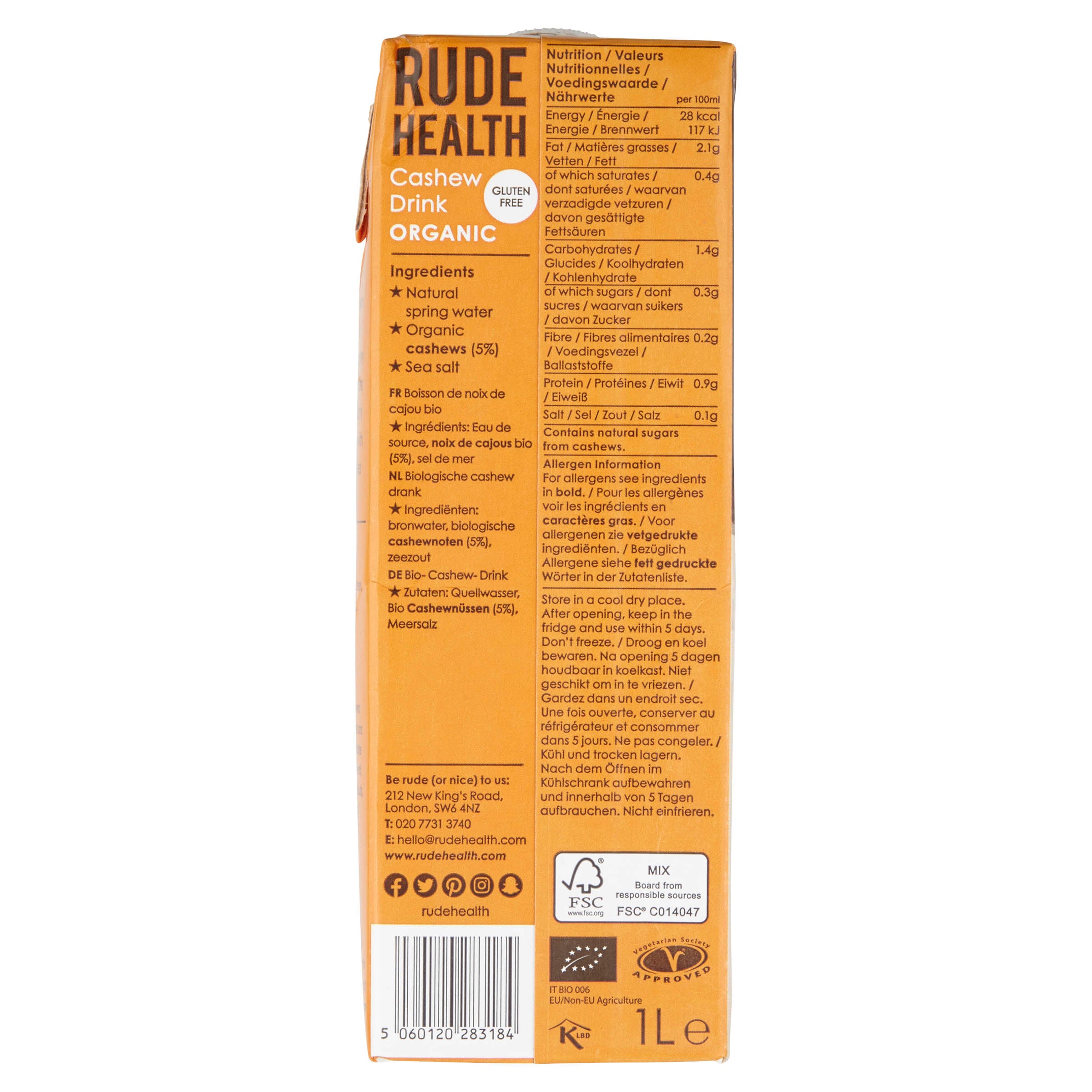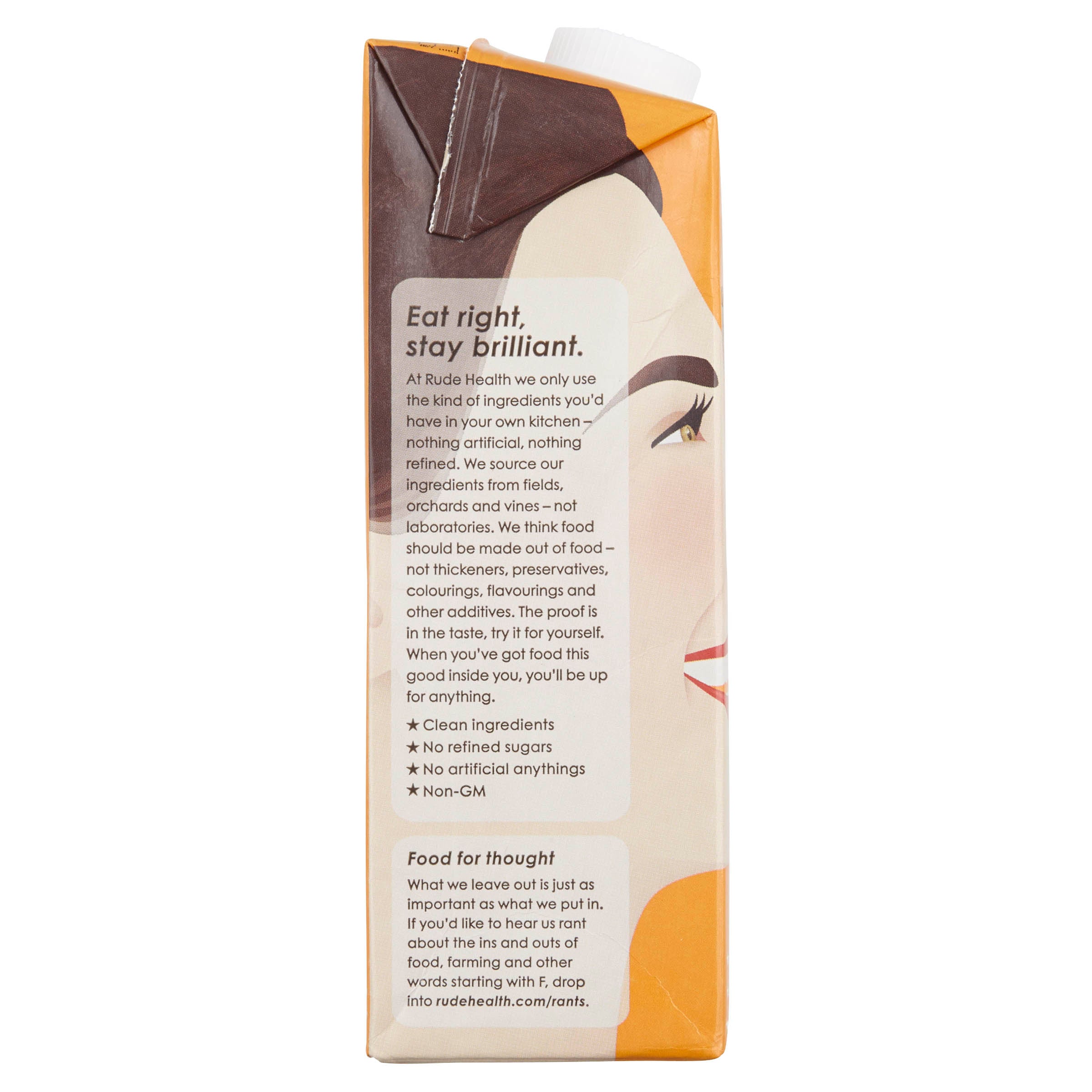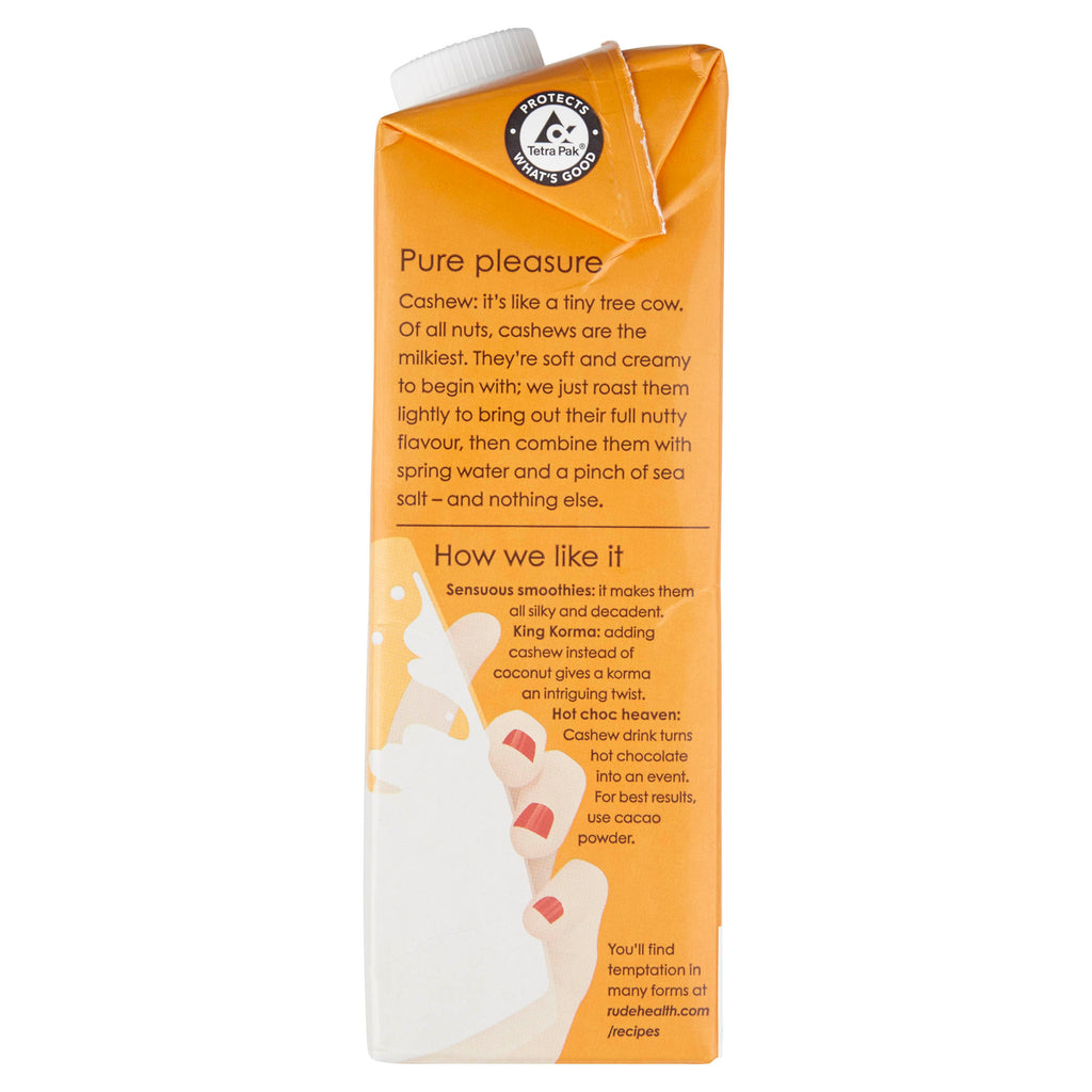 "Rude Health Cashew milk is for purists, made from only spring water, organic cashews (5%) and sea salt. The cashews are freshly roasted for ultimate nuttiness, then blended into a creamy, refreshing and nutritious drink. Pour into a glass straight from the fridge or add into smoothies, cocktails and desserts."