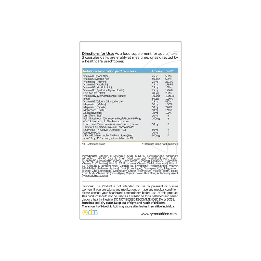 RYM DAILY MULTIVITAMIN – Immunity & Energy capsules are designed with botanicals & nutrients to support your brain health in 5 ways- Sleep, Memory, Energy, Concentration and Mood. RYM botanical extracts contain the highest levels of active bio ingredients in the most potent form obtained through modern extraction technologies. They are unique fusion of Vitamin B-complex with high B12, Vitamin C, Vitamin D3, Zinc, triple Magnesium complex, L-Carnitine, Coenzyme Q10, Vegan DHA, Reishi & Lions mane Mushroom plus KSM-66 Ashwagandha.