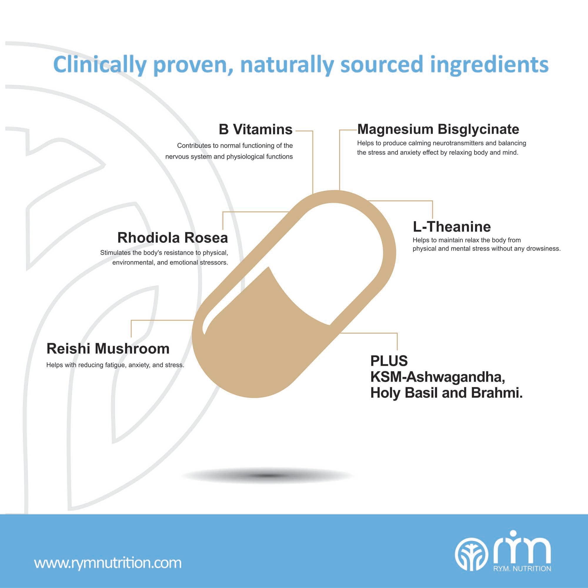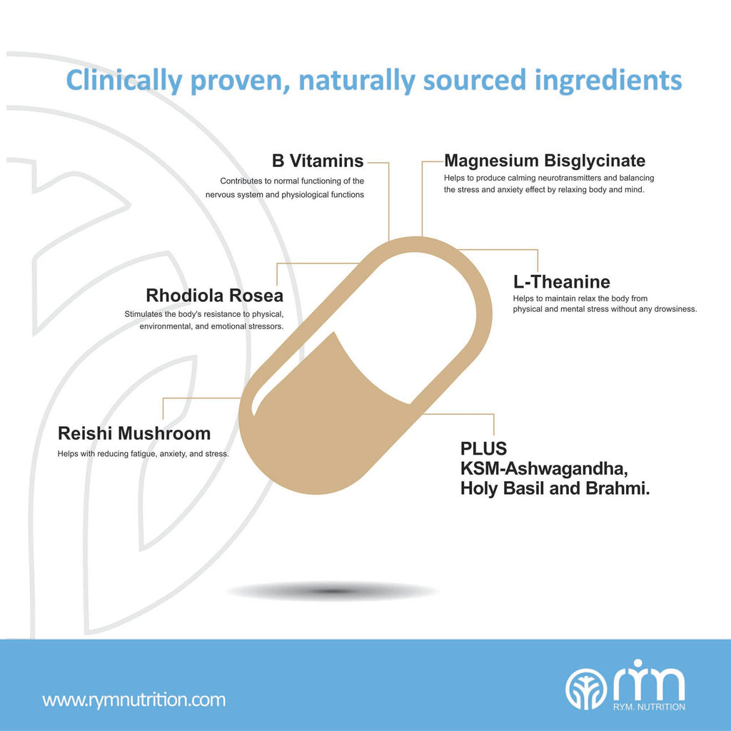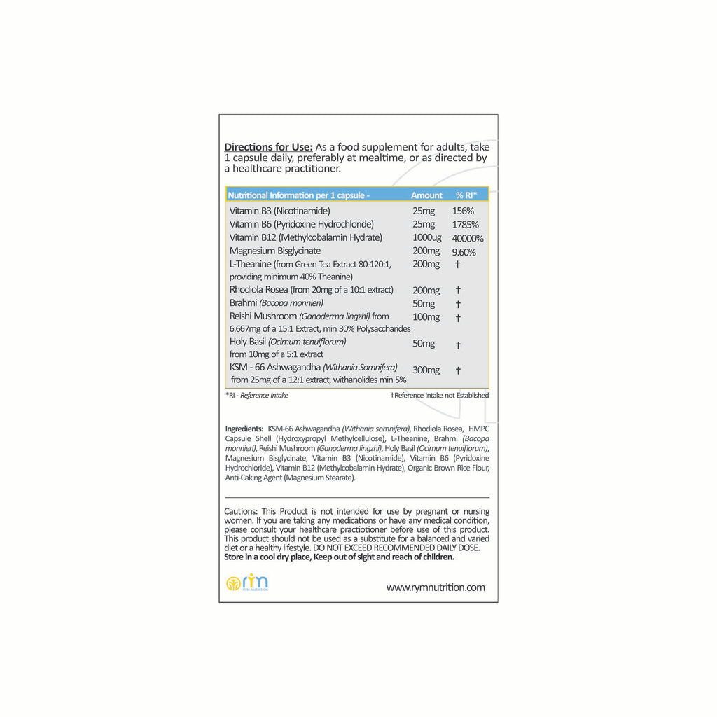 "RYM De-Stress – Relax & Calm capsules are designed with botanicals & nutrients to reduce your stress & anxiety, improve mood, boost energy levels, and promote natural restful sleep. RYM botanical extracts contain the highest levels of active bio ingredients in the most potent form obtained through modern extraction technologies. They are unique fusion of B Vitamins, Rhodiola Rosea, Holy Basil, Magnesium, Theanine, KSM-66 Ashwagandha, Reishi Mushroom plus Brahmi."