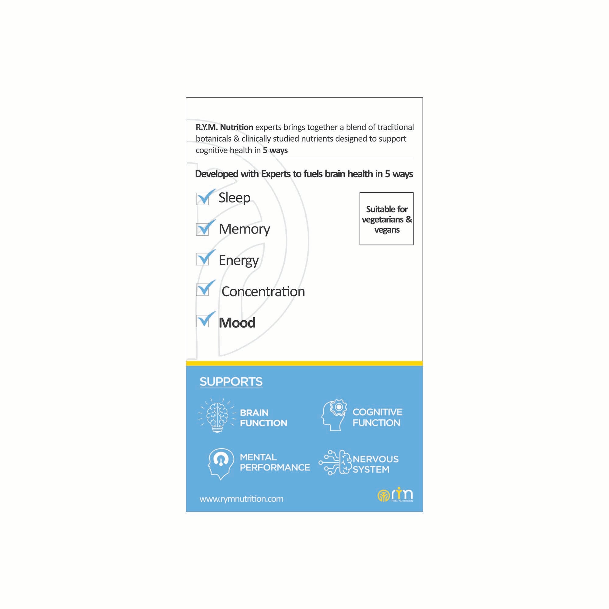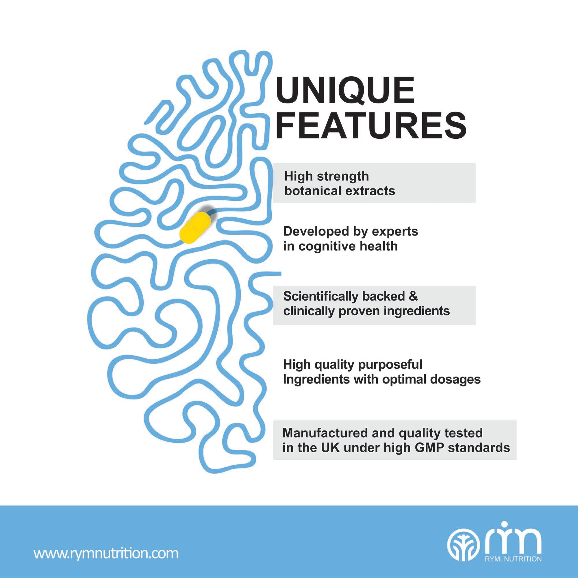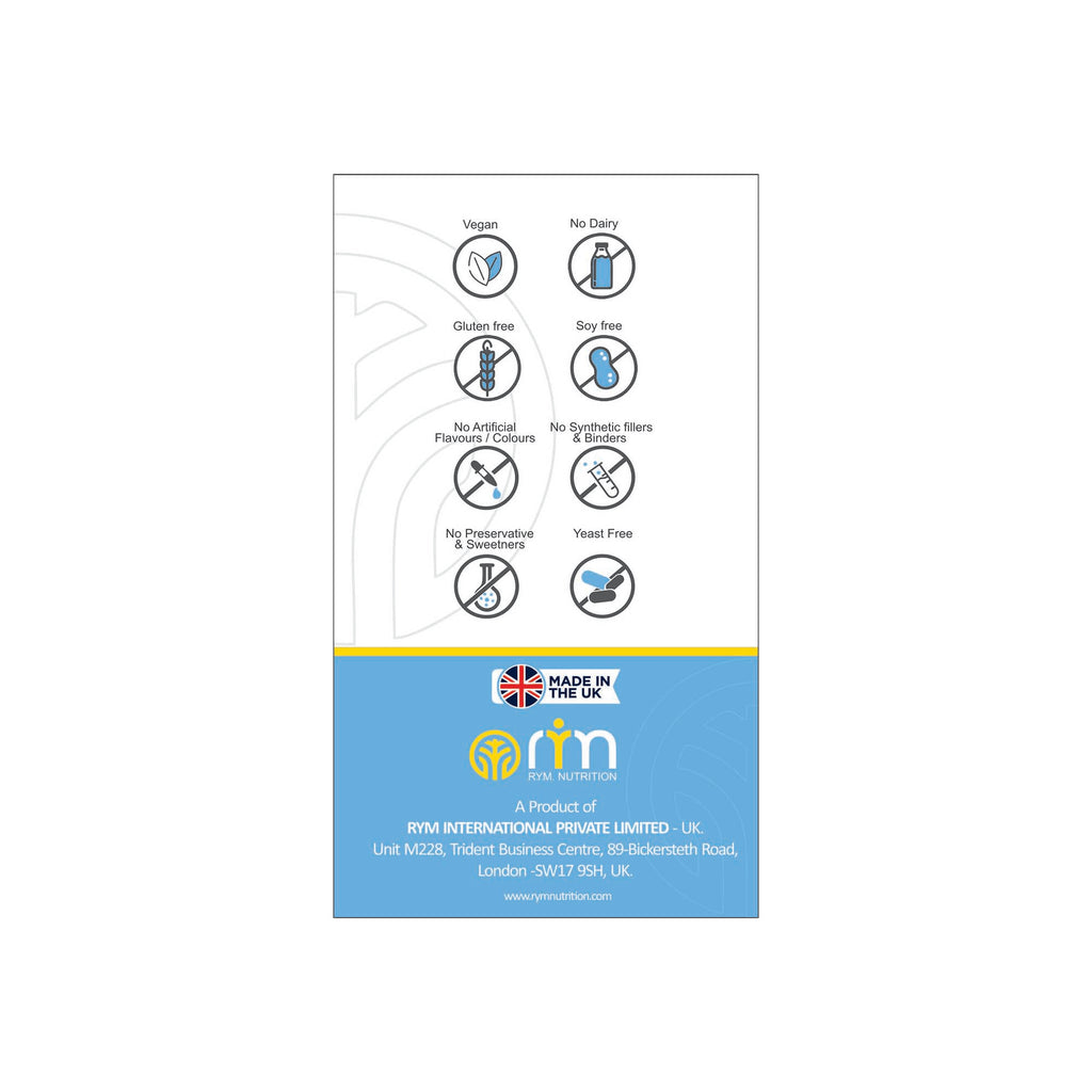 "RYM De-Stress – Relax & Calm capsules are designed with botanicals & nutrients to reduce your stress & anxiety, improve mood, boost energy levels, and promote natural restful sleep. RYM botanical extracts contain the highest levels of active bio ingredients in the most potent form obtained through modern extraction technologies. They are unique fusion of B Vitamins, Rhodiola Rosea, Holy Basil, Magnesium, Theanine, KSM-66 Ashwagandha, Reishi Mushroom plus Brahmi."