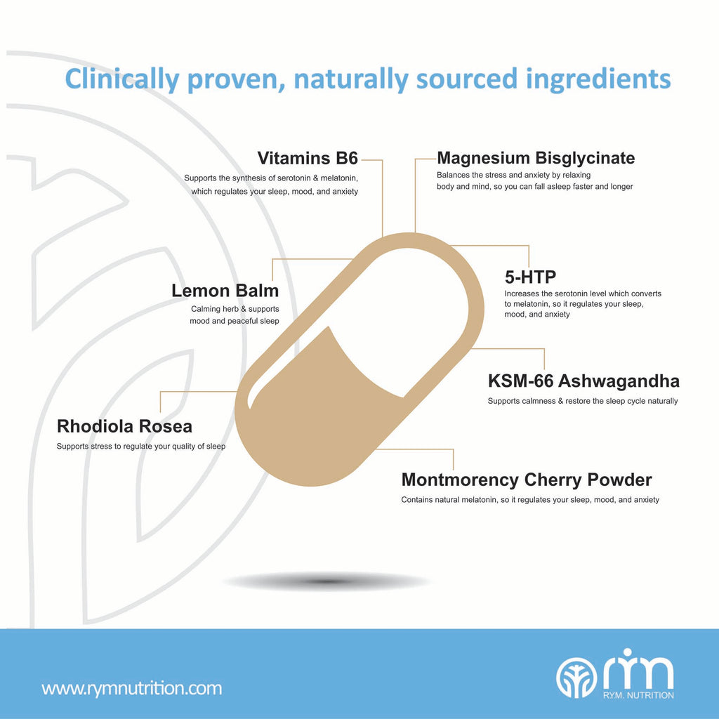 "RYM Sleep – Rest & Restore capsules are designed with botanicals & nutrients to support and reduce stress, relax muscles, support your body with producing natural melatonin and ultimately help you fall asleep, stay asleep and wake up feeling refreshed and restored. RYM botanical extracts contain the highest levels of active bio ingredients in the most potent form obtained through modern extraction technologies. They are unique fusion of Vitamin B6, Magnesium Bisglycinate, 5 HTP, Lemon Balm, Rhodiola Rosea, Montmorency Cherry Powder and KSM-Ashwagandha"