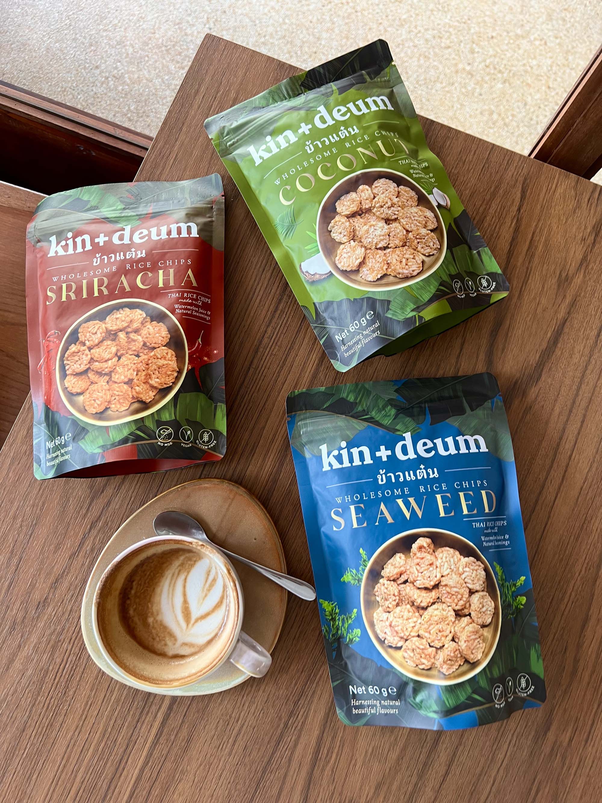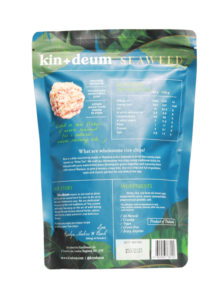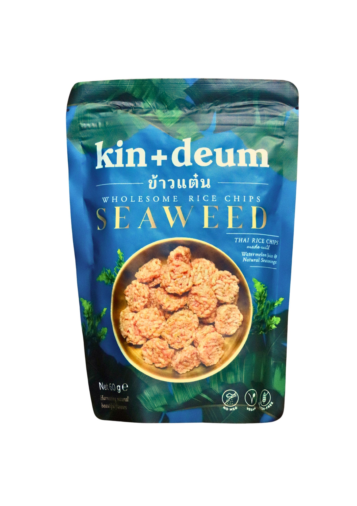 "Inspired by coastal Thai flavours, Kin+Deum Seaweed Wholesome Rice Chips offer a light, umami-rich crunch with every bite. Sprinkled with roasted seaweed flakes and naturally seasoned, they deliver a savoury and moreish flavour that’s refreshing and satisfying.Crispy, clean, and feel-good snacking at its best - these chips are gluten-free, vegan, and contain no MSG or artificial additives."