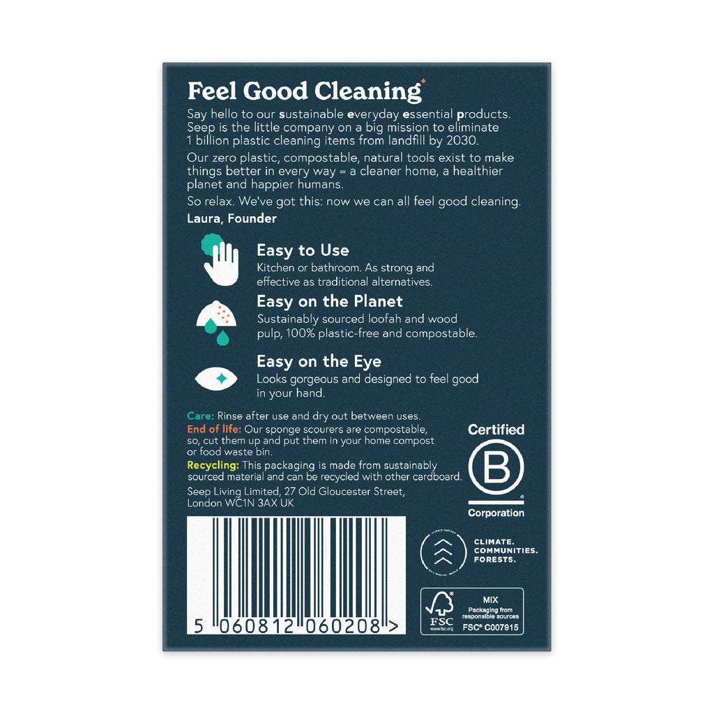 Sustainably sourced cellulose with a loofah scourer. 100% plastic free. Long-lasting. Compostable: cut into pieces to aid/speed up composting and pop in your compost bin/organic waste bin